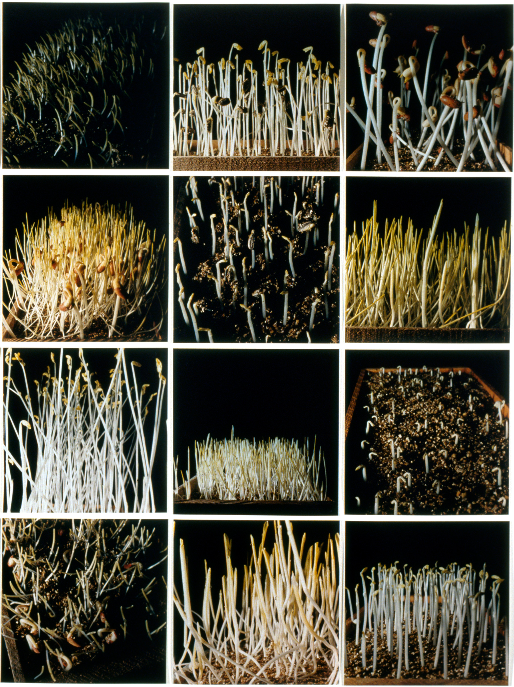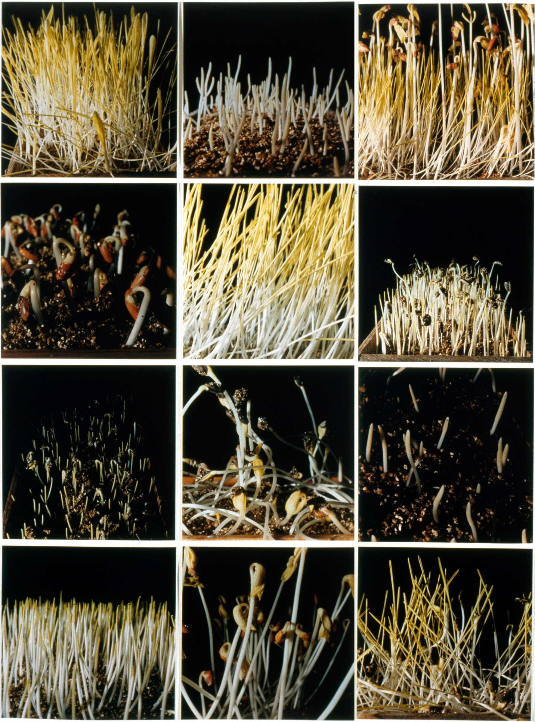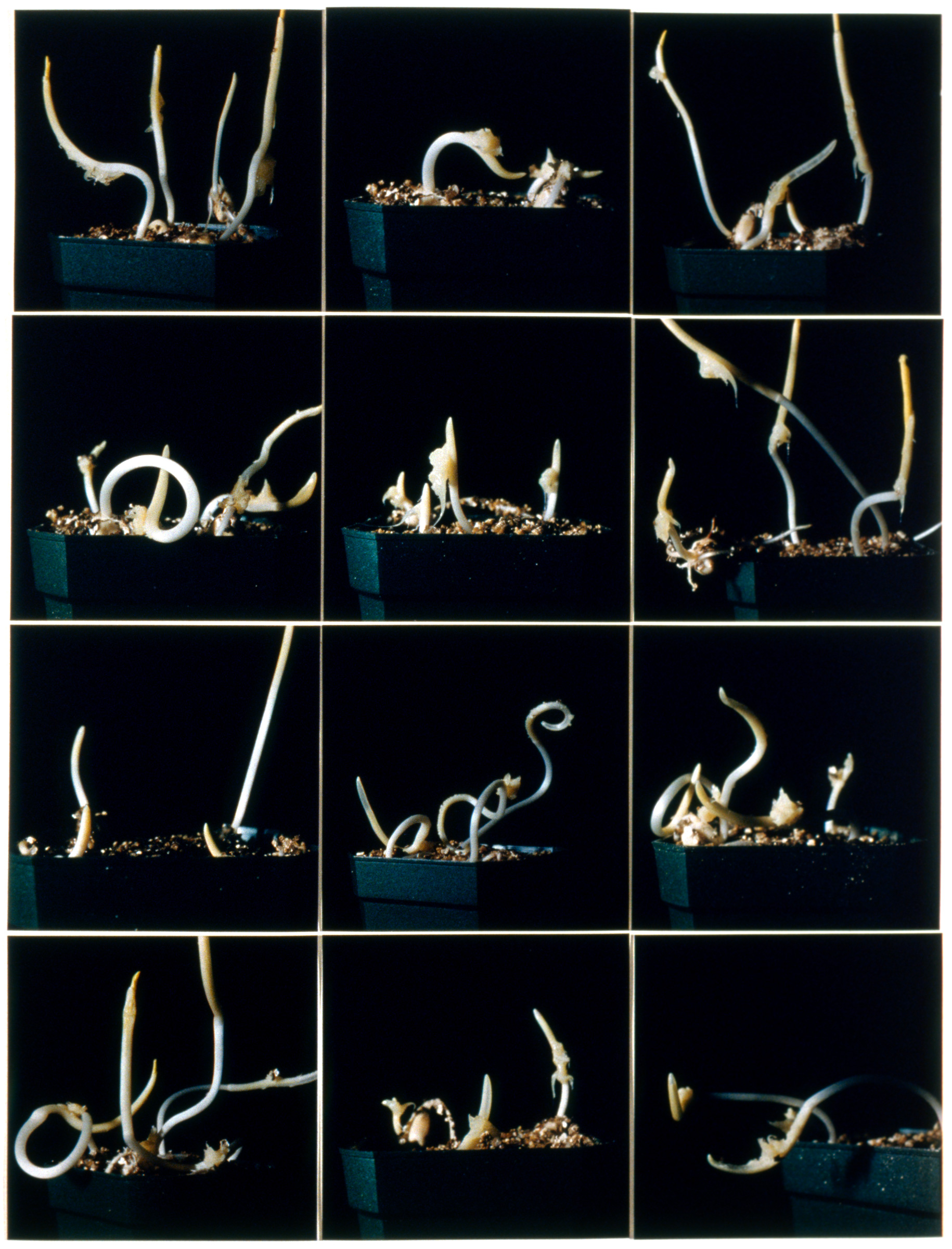 By precise perturbation and observation, botanists accumulate facts and put forth hypotheses (stories) about the life of plants. Some experiments are so definitive in the construction of these stories they become classics and are widely repeated in the science classroom. The same species of plants are grown over and over, the same manipulations performed upon them as pivotal experiments are replayed. Like circus trainers, we induce our subjects to perform their well-rehearsed tricks. But after the show is over and the audience has gone home, the experimental plants grow on. In Deviation From Normal, I am interested in how such manipulated plants continue to grow, in individuality vs. similarity, in the way components form wholes, in the way science is constrained by logic.