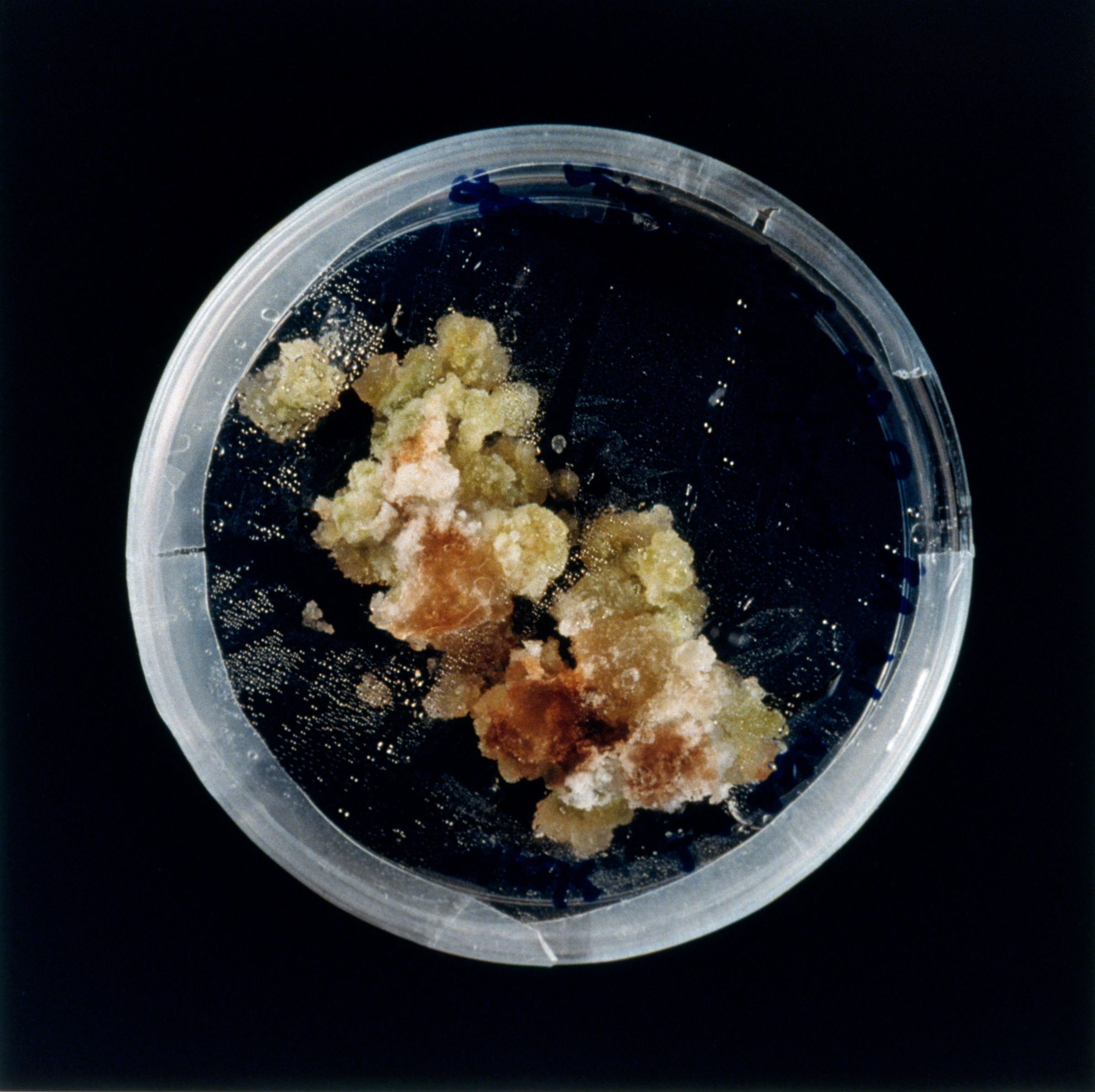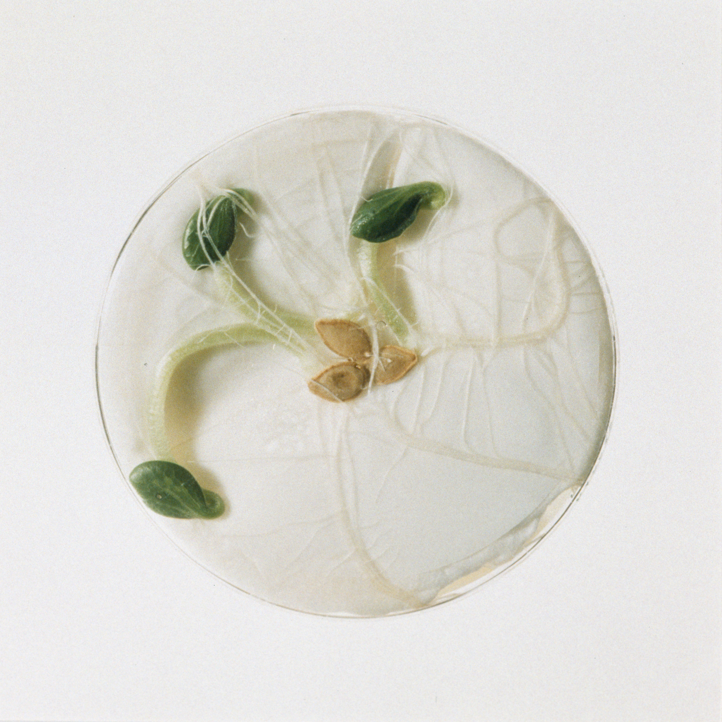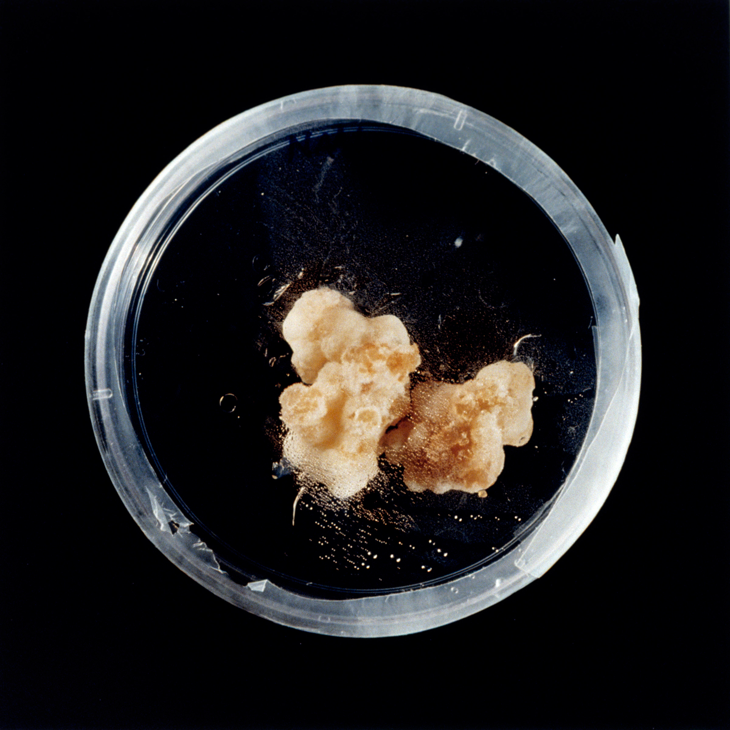 Parenchyma cells from many plants, including tobacco, will de-differentiate and form a mass of callus tissue when isolated and grown sterilely on nutrient medium. After a time, the chunks of callus can be transferred to media containing growth hormones that induce the tissue to produce shoots or roots. As the ratio of two such plant hormones is systematically changed, the appearance of the callus changes. The petri dishes in Dark Matter are an actual data grid of increasing BA (for shoots) in the horizontal direction, and increasing NAA (for roots) down the vertical direction.