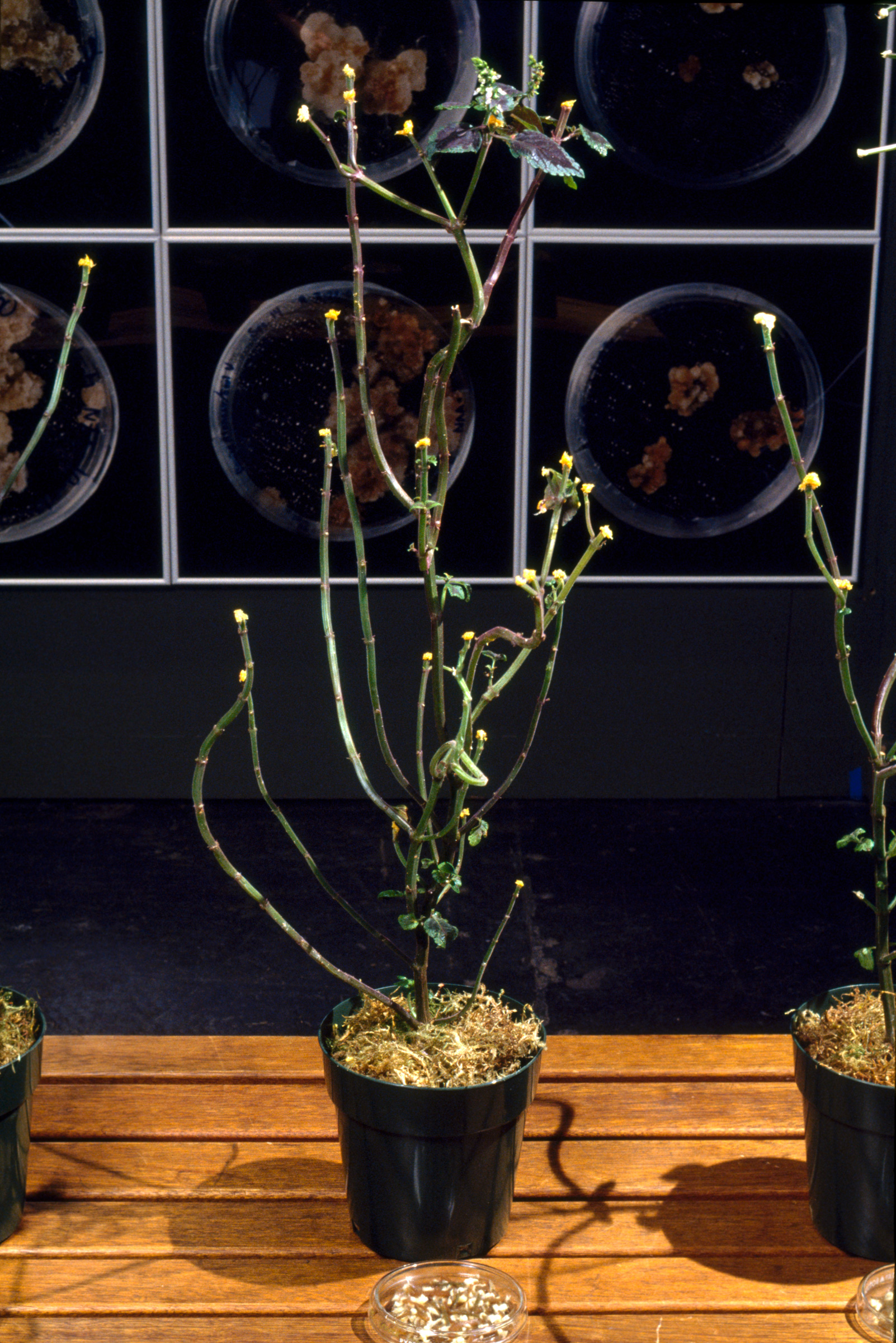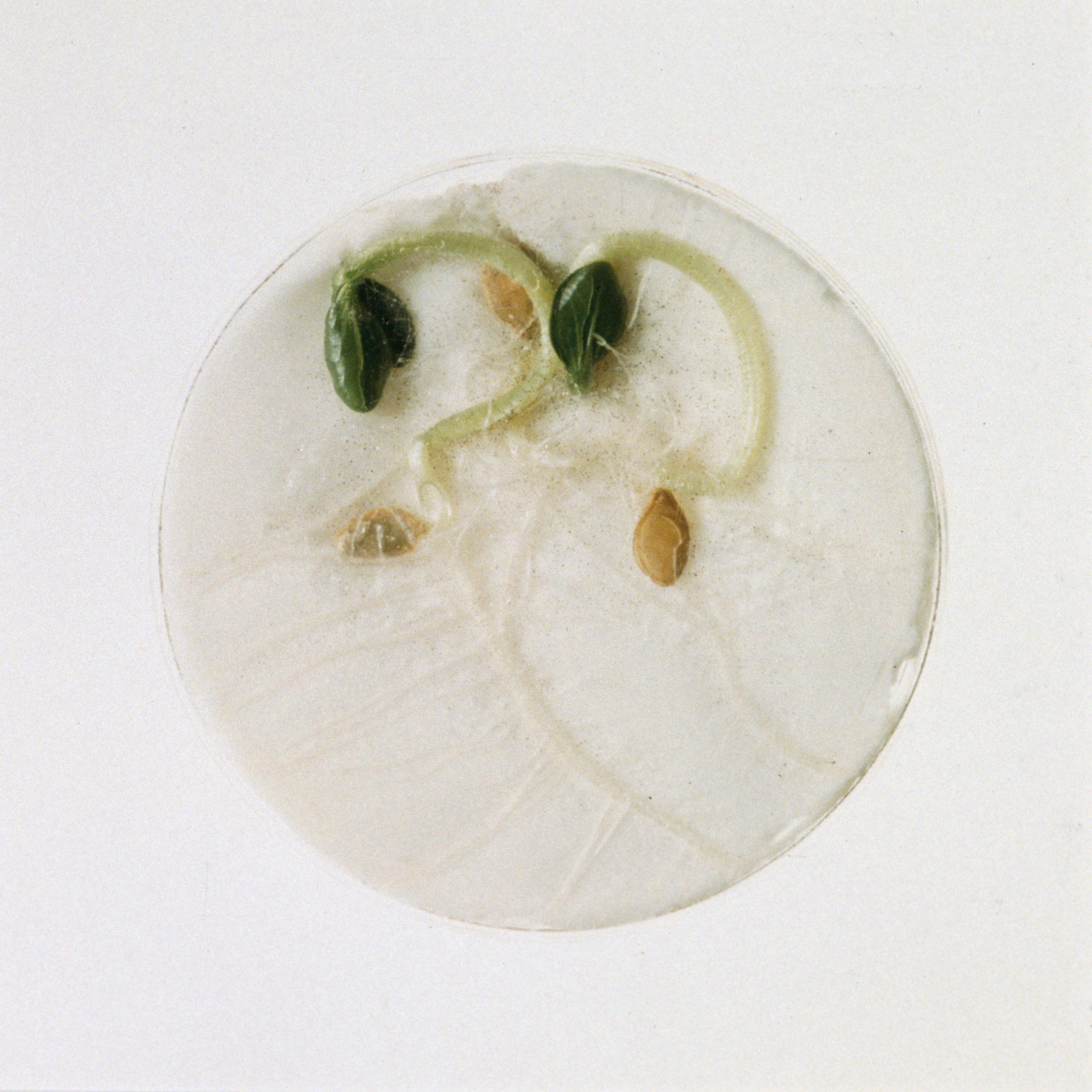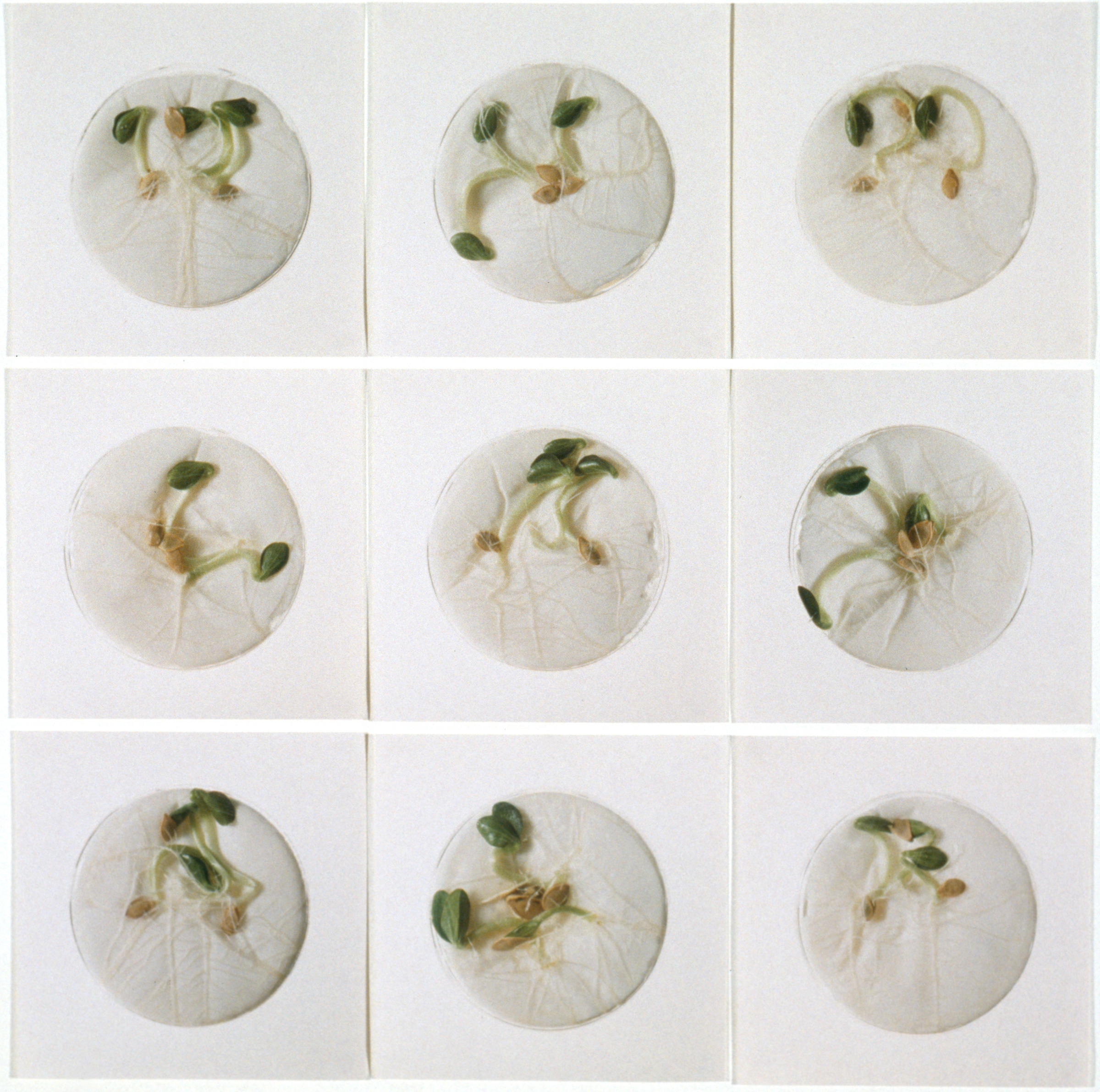 Parenchyma cells from many plants, including tobacco, will de-differentiate and form a mass of callus tissue when isolated and grown sterilely on nutrient medium. After a time, the chunks of callus can be transferred to media containing growth hormones that induce the tissue to produce shoots or roots. As the ratio of two such plant hormones is systematically changed, the appearance of the callus changes. The petri dishes in Dark Matter are an actual data grid of increasing BA (for shoots) in the horizontal direction, and increasing NAA (for roots) down the vertical direction.