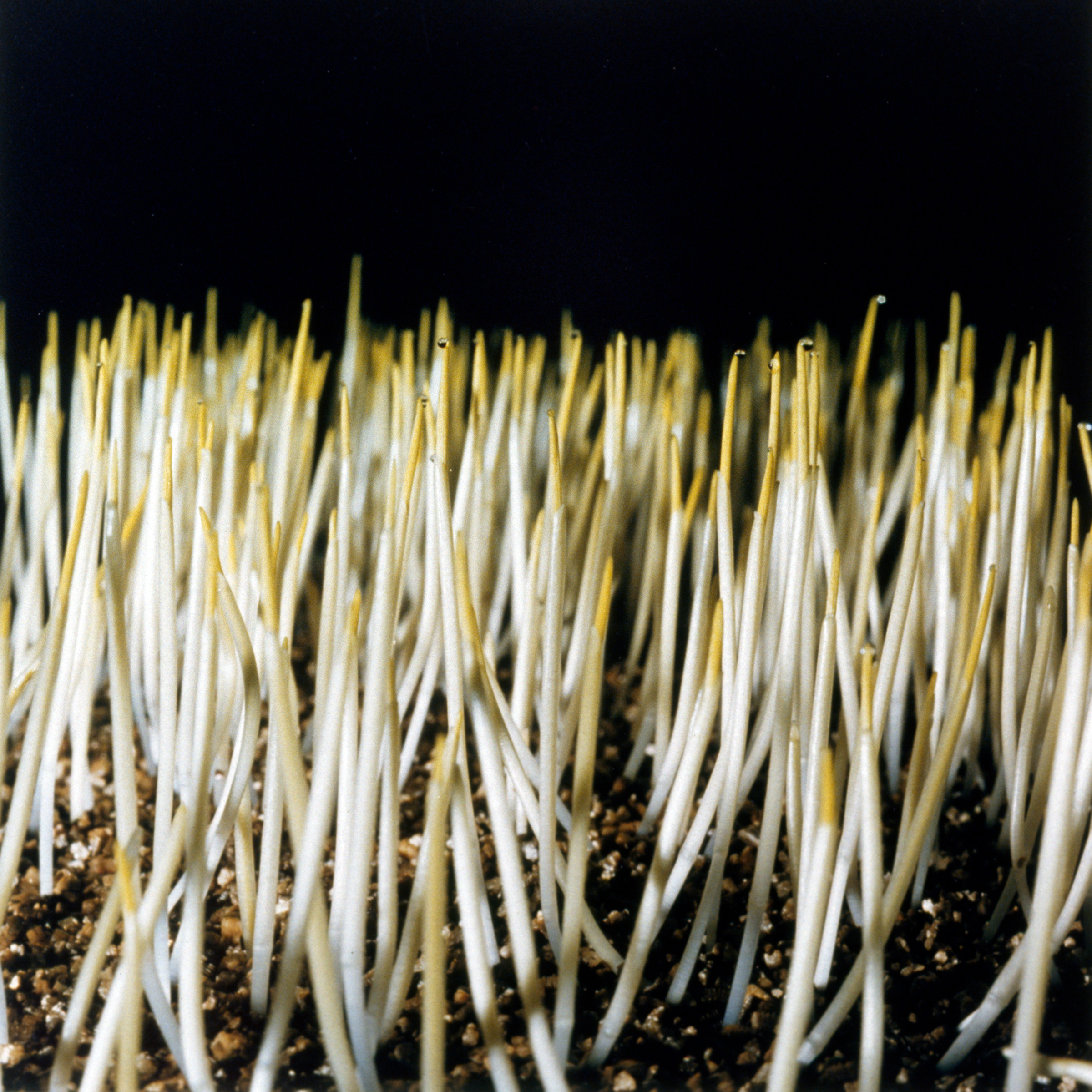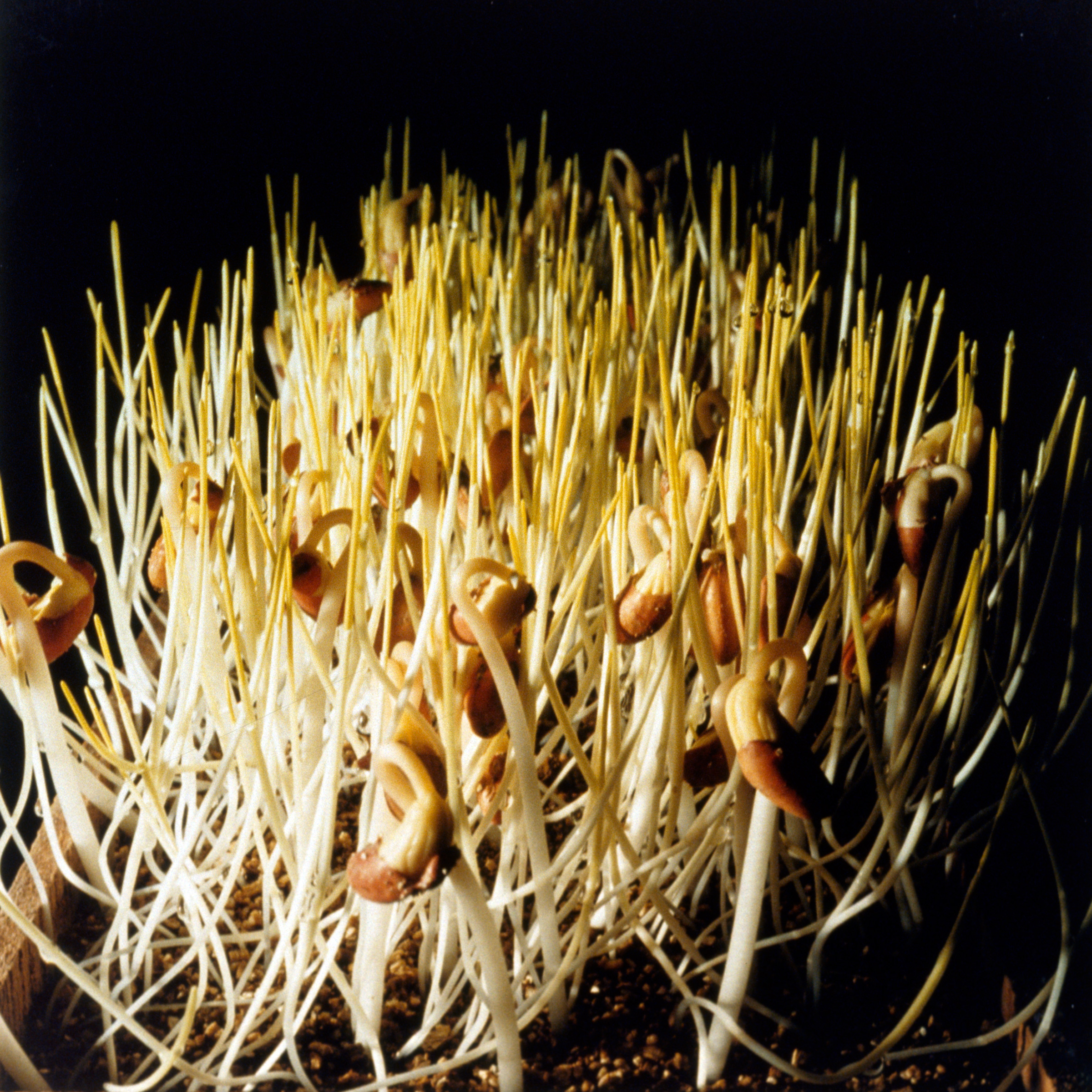 Radish seeds are germinated in the dark, on filter paper in petri dishes, so that students can see the root hairs on the new roots. This takes about three days. After another week in the light, the seedlings are expanding leaves and pressing against the top of the dishes; the roots are a tangled mess without obvious hairs.