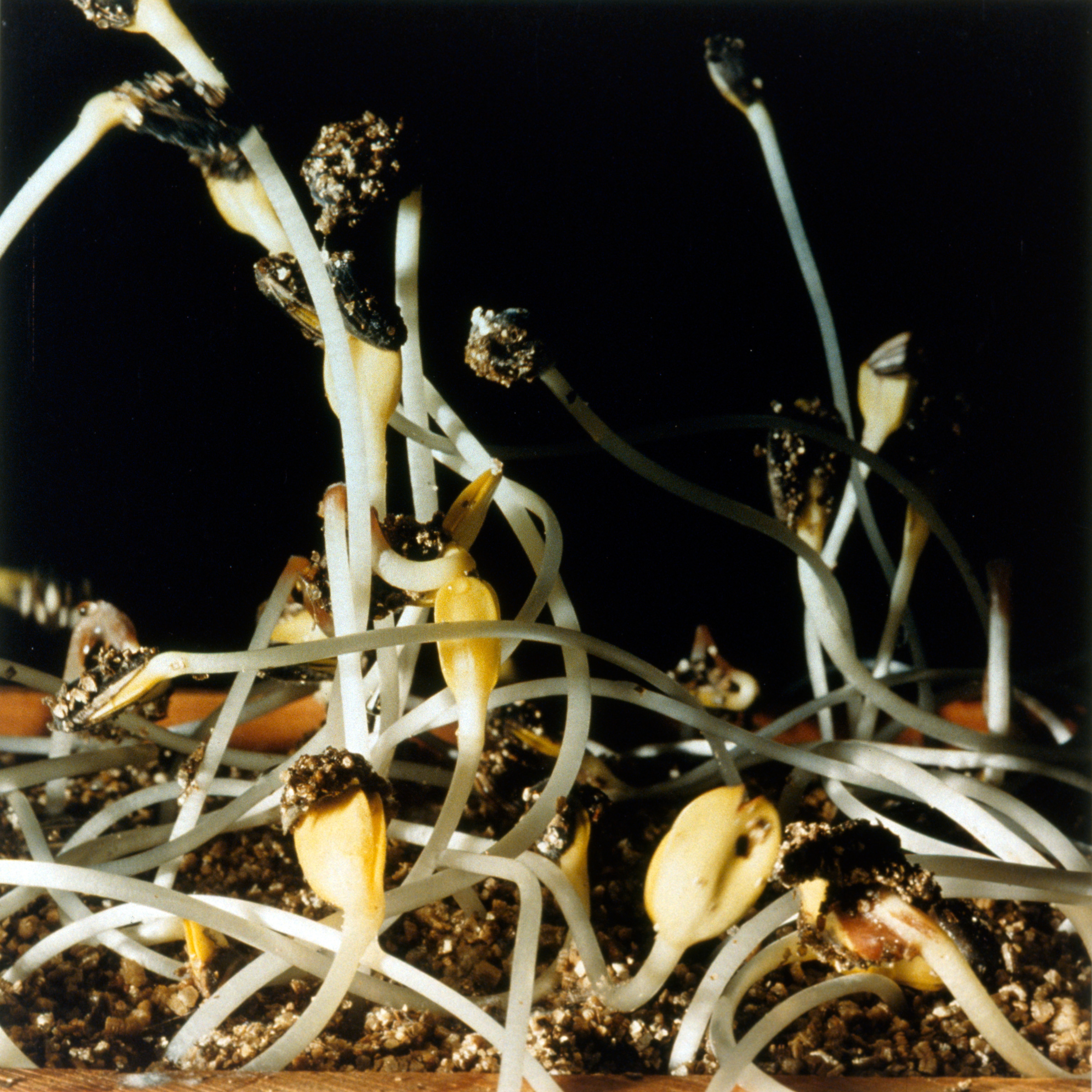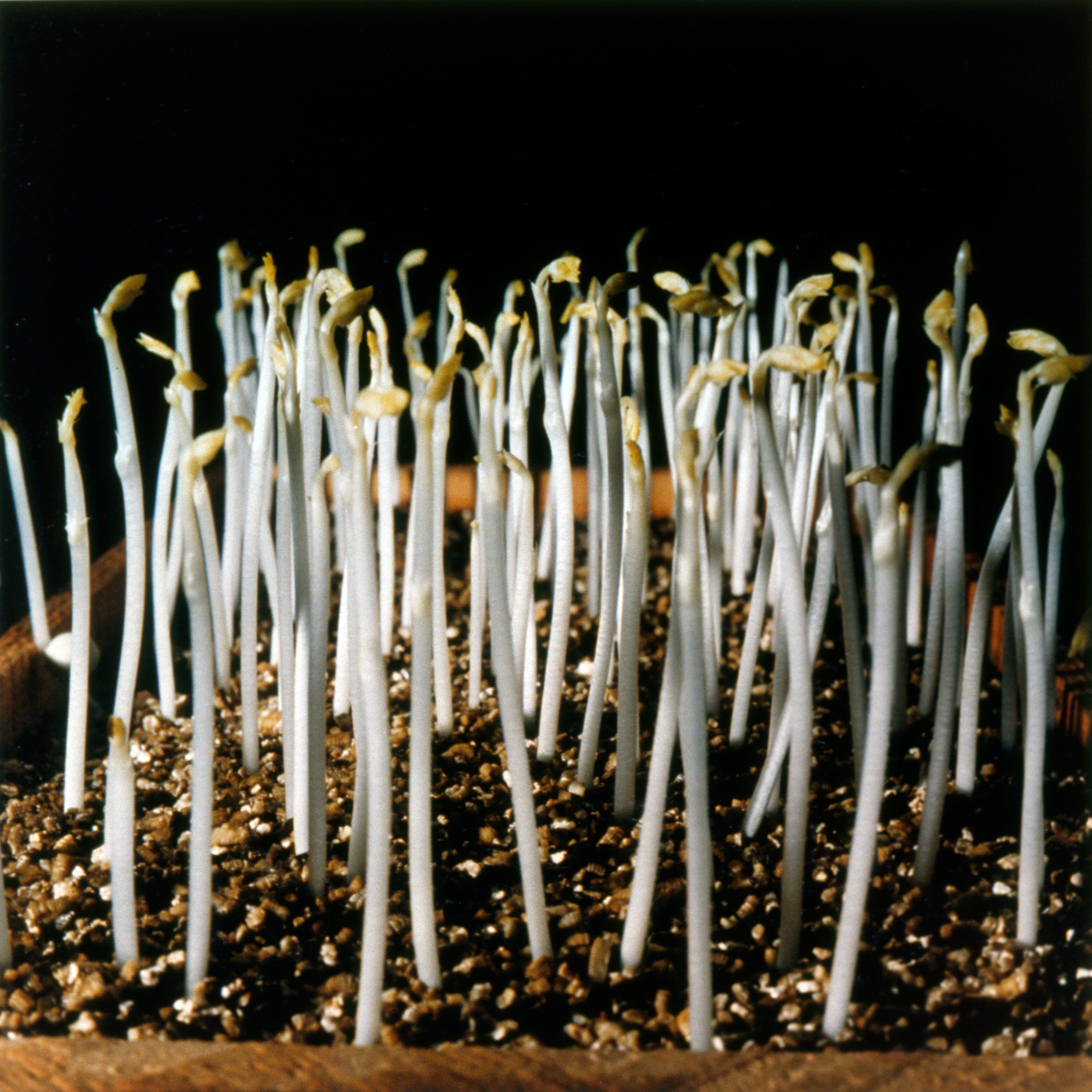 Seedlings for physiology experiments are often grown in the dark where they fail to develop their light-gathering pigments. The seedlings are etiolated: elongated, pale, with tiny leaves. Large-seeded species, such as corn, beans, sunflowers, oats, and peas, can live for two or three weeks in the dark, if they have water. But without chlorophyll, they cannot photosynthesize and quickly die when the stored food from the seed is exhausted.