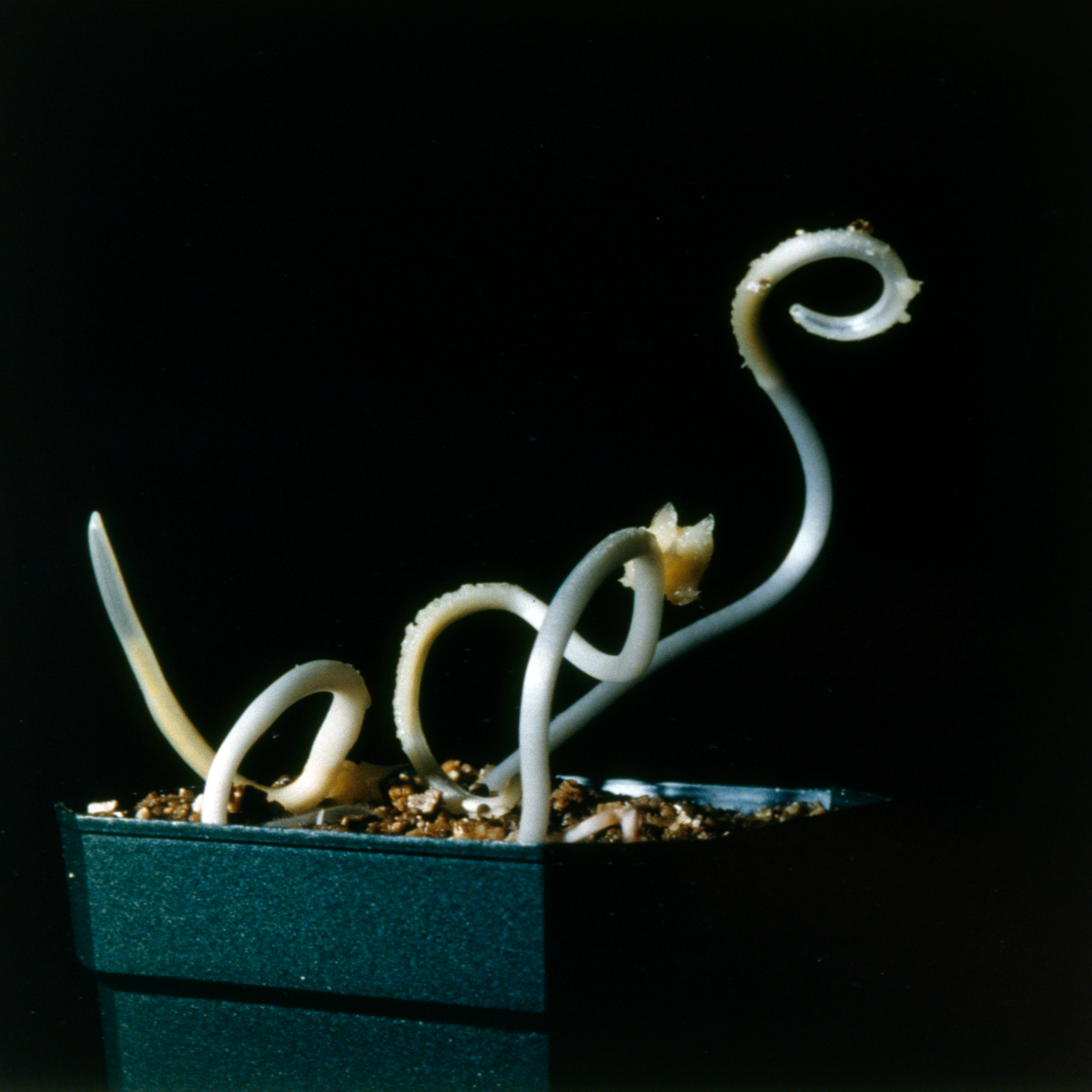 Squash seeds appressed with moist cotton to the glass of a petri dish, always germinate with the roots growing down. This makes a dandy demonstration of the fact that roots grow toward a gravitational field, a phenomenon called gravitropism. If the petri dishes are taped to a slowly-rotating vertical wheel, the direction of gravity is constantly changing for the seeds inside, and the emerging roots grow in a circle. Shoots also respond to gravity: they grow in the opposite direction, exhibiting negative gravitropism.