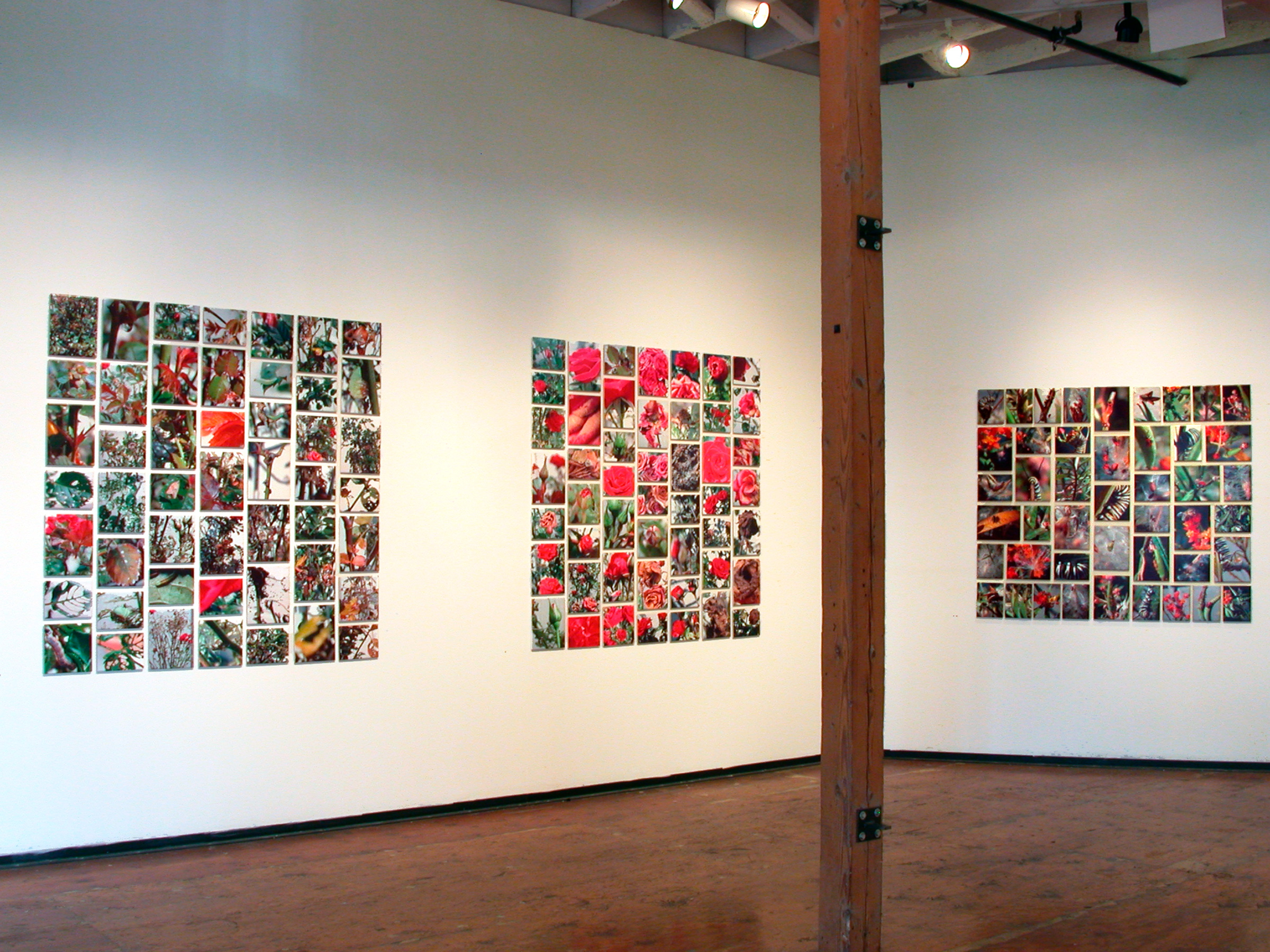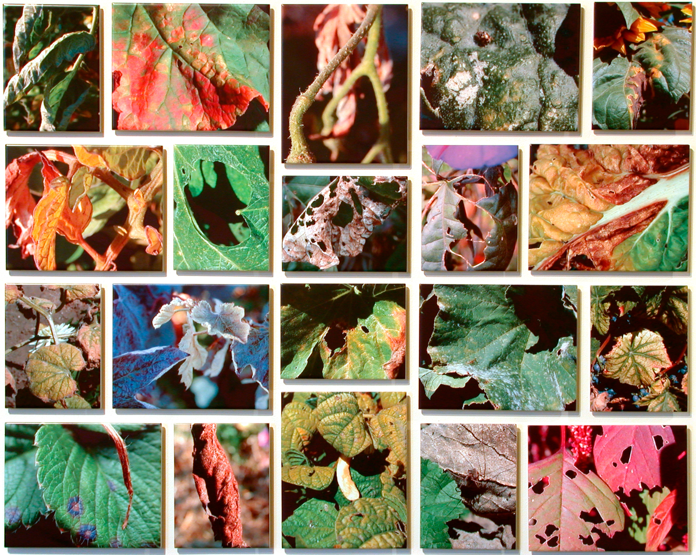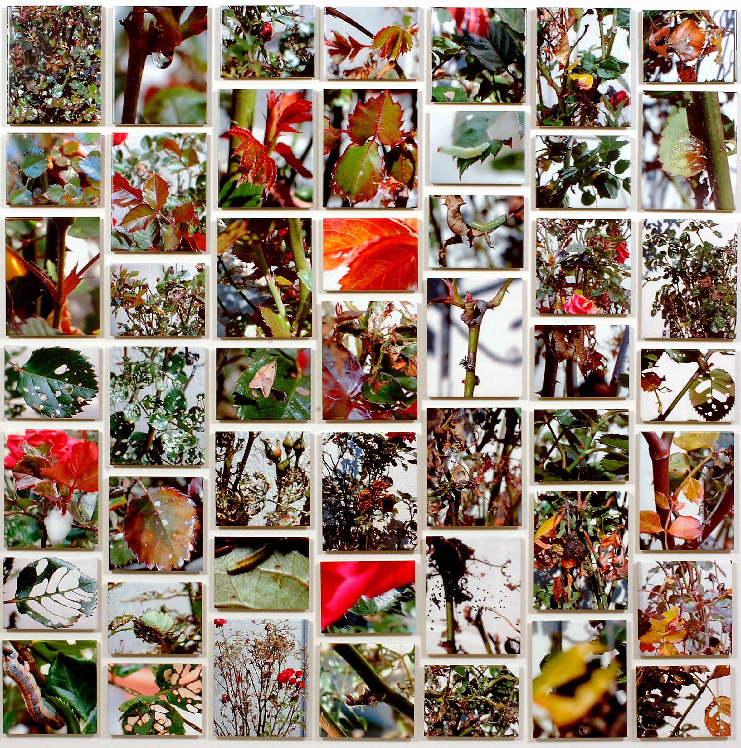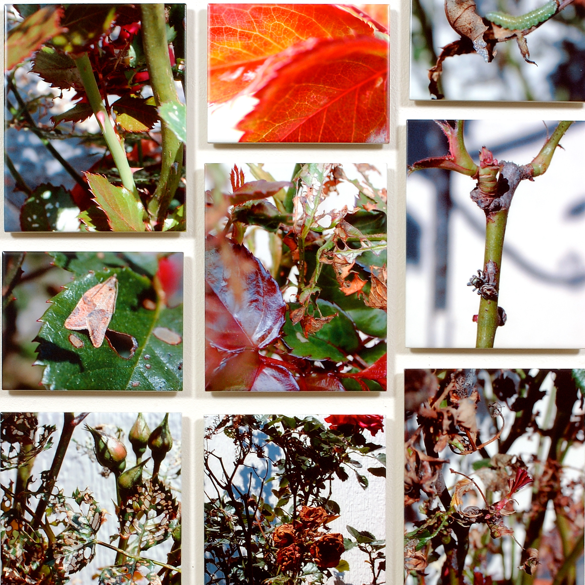 For the two pieces that make up Annual Cycle (2005), I photographed a potted, miniature rose plant every week for a year. I observed two complementary growth cycles in this time. Flower buds repeatedly appeared, expanded into roses, and senesced. Leaves, abundant and fresh in spring, were skeletonized by sawfly larvae (which look like green caterpillars). When the soft leaf tissue was gone and the larvae therefore no longer present, the plant simply grew a new set of leaves. It continued to replace lost leaves throughout the year. Regrowth of foliage after loss to herbivores is the ultimate plant strategy for tolerating herbivory. Because the evolutionary history of plants is one of co-evolution with herbivores, there has never been a time when plants were not eaten, which has profoundly shaped the unique nature of plant life.