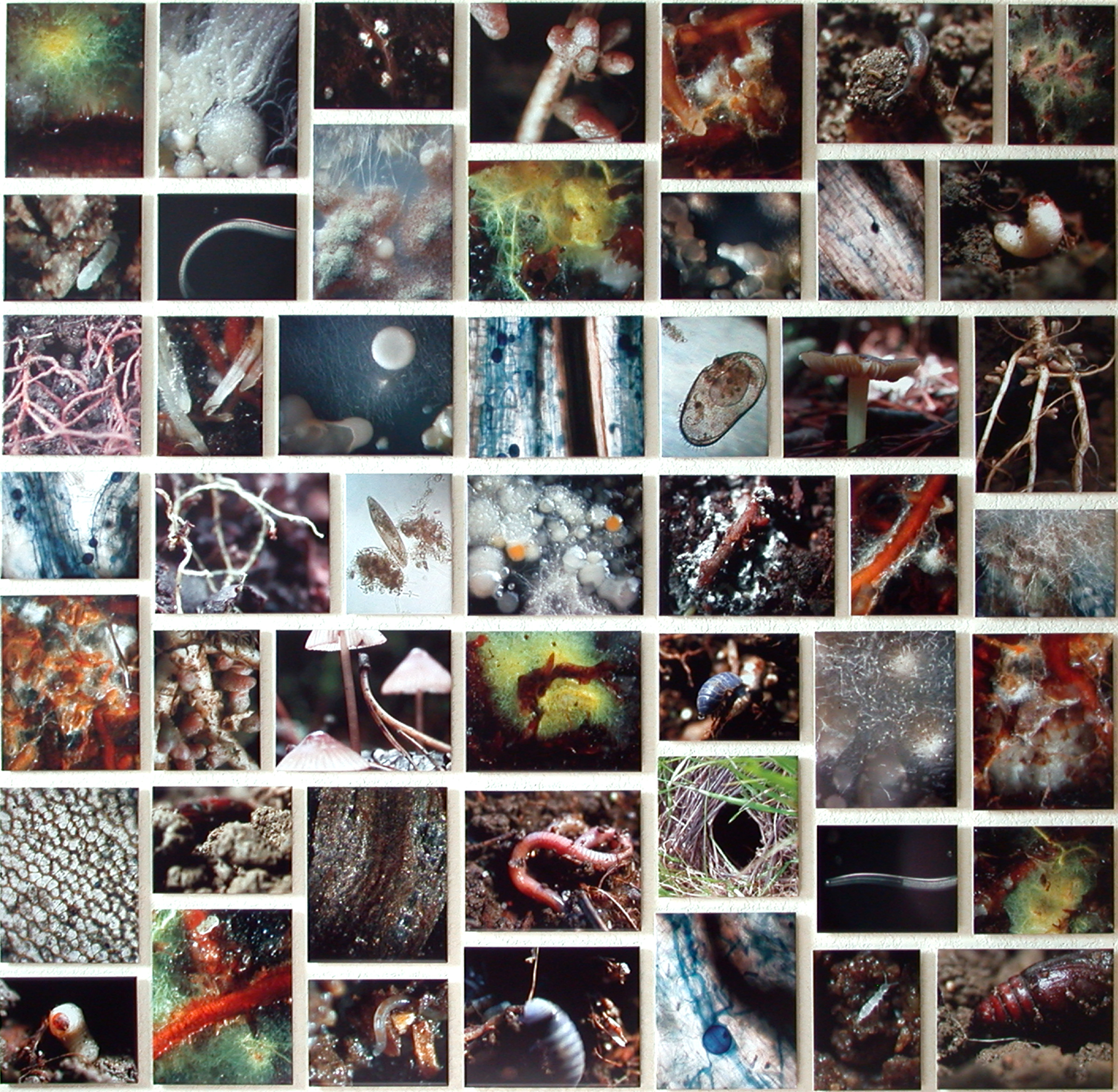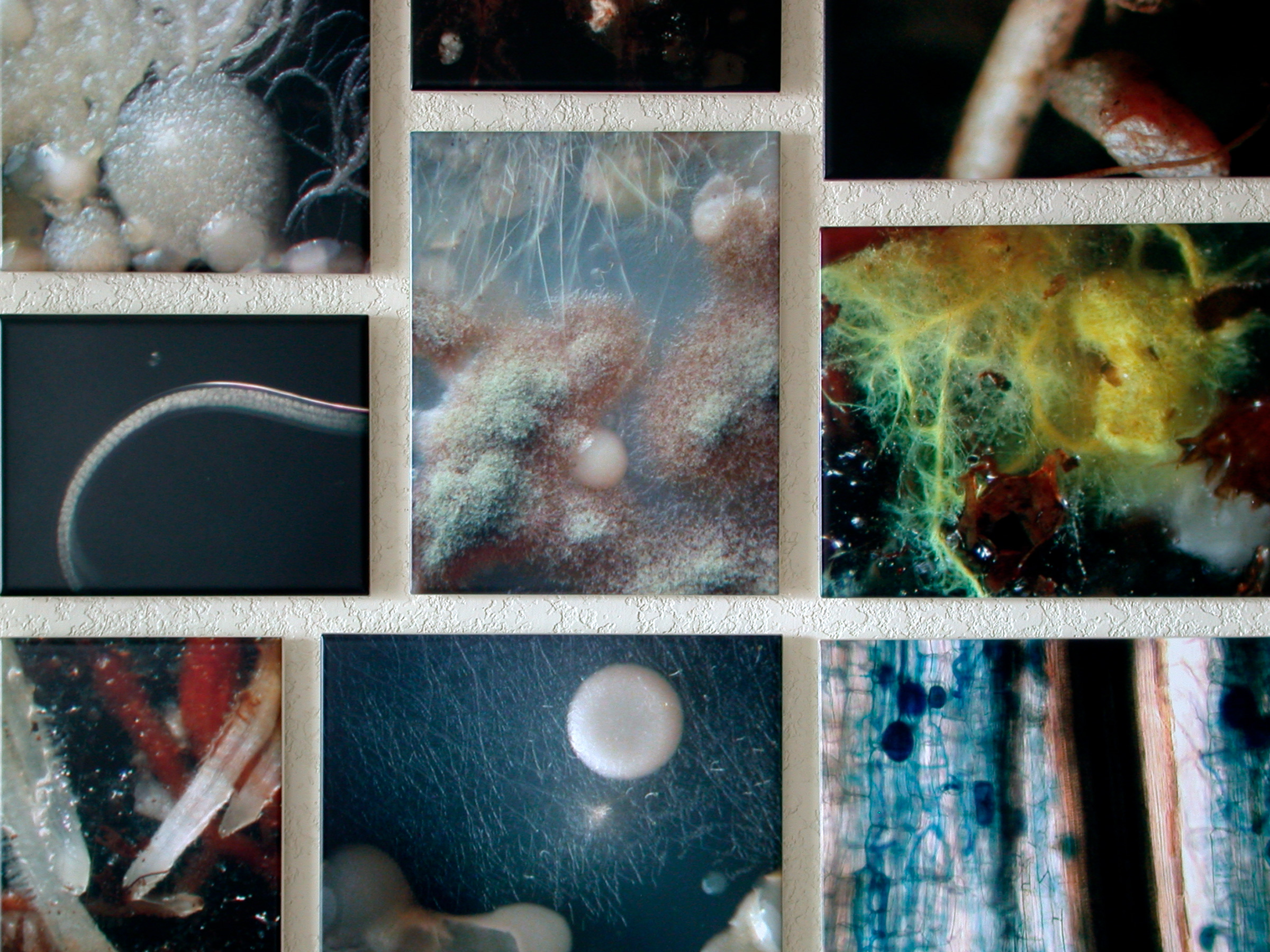 The Root Zone (2006) features organisms of the soil food web. Billions of bacteria and fungi feed on exudates and sloughed tissue from plant roots. They in turn are fed upon by protozoa and nematodes. Protozoa and nematodes are eaten by tiny insects and other arthropods which are eaten by larger insects, and so on up the size scale to more familiar slugs, centipedes, earthworms, gophers and other animals. A functioning soil food web locks up nutrients such as carbon and nitrogen in the bodies of these organisms, releasing them slowly as needed by plants. Because these lifeforms are small and live in the dark, they are difficult to see. Some I photographed alive, either in situ or excavated. I grew soil bacteria and fungi on nutrient agar and photographed the resulting colonies. To depict one kind of mycorrhizae, which are vital symbiotic root/fungus organs, I micrographed prepared, stained roots on microscope slides. I also photographed living ectomycorrhizae of pine roots being grown for a research project.