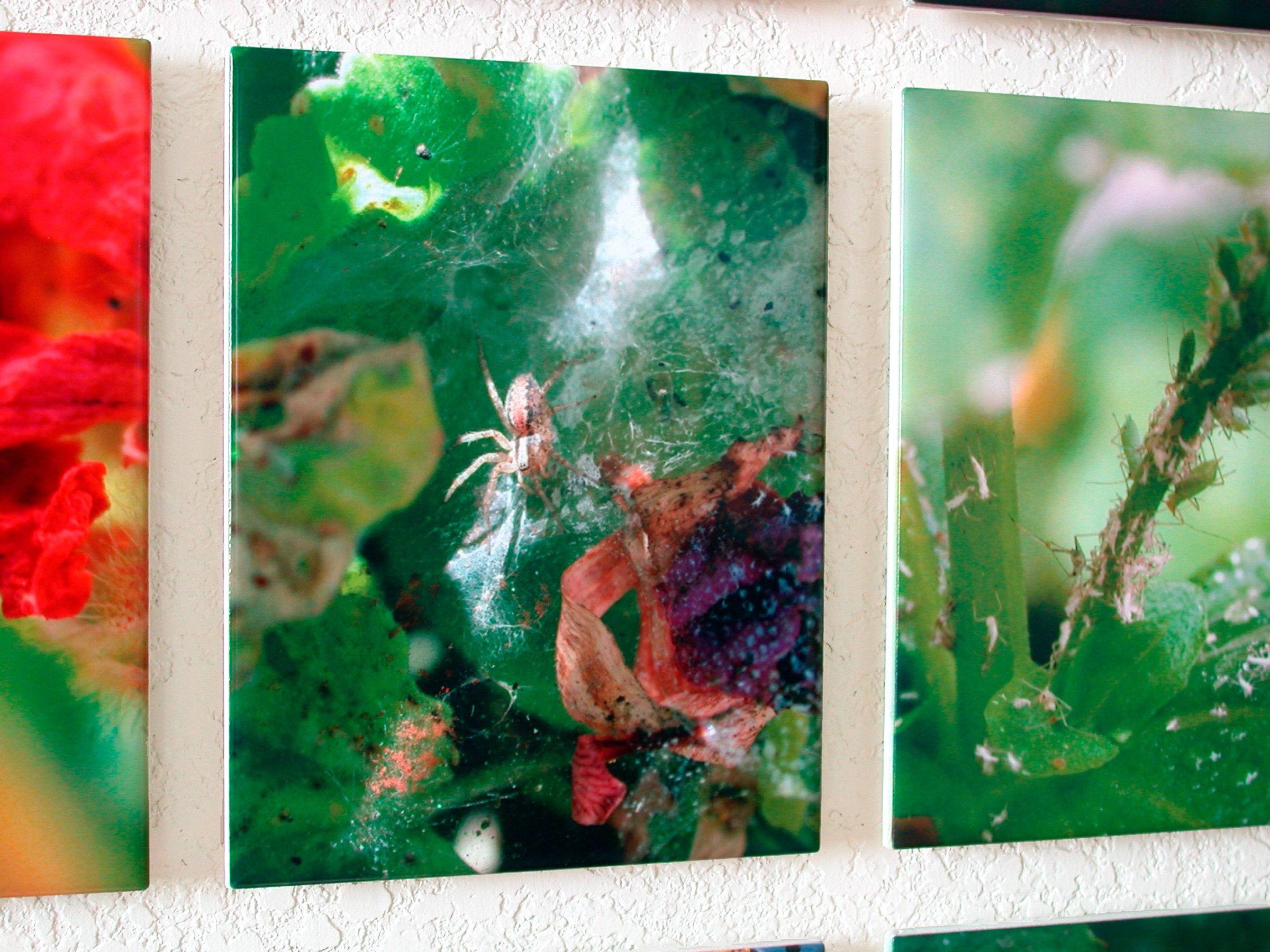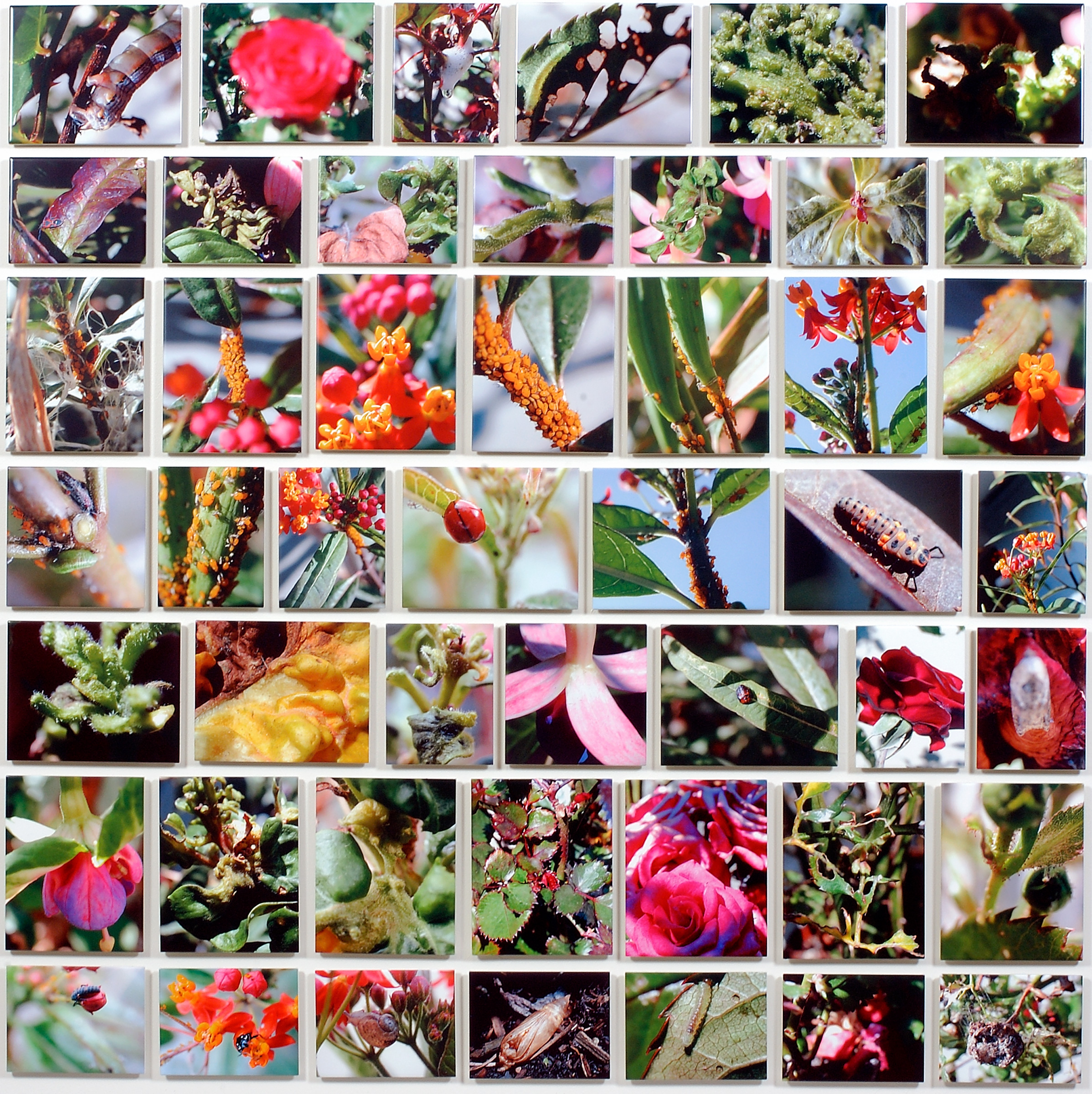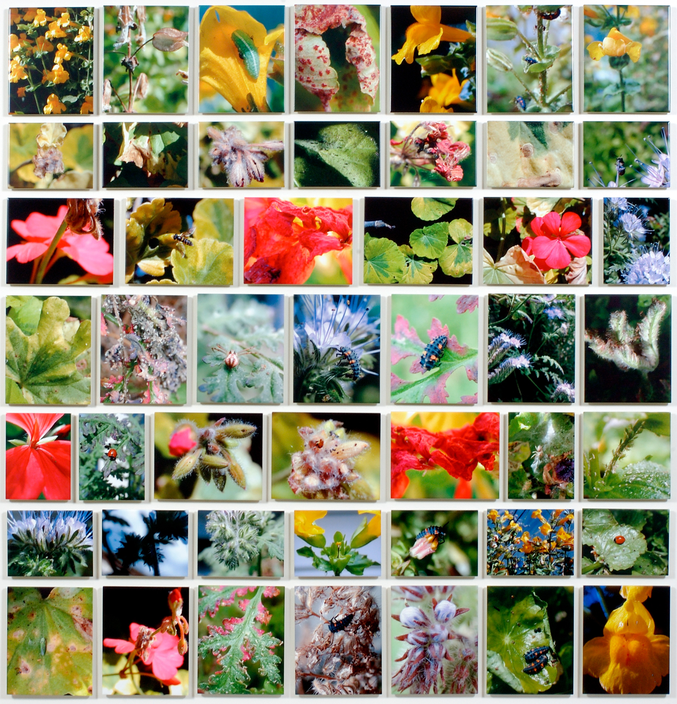 By contrast, Garden looks at specific participants in the kind of relationships that form the communities which comprise the complex system we call the biosphere. For each work in Garden, I photographed, over a period of time, plants and their associates from my own and other gardens. By spending time with the plants, I could see and document their insect visitors, as well as resident organisms such as fungi, spiders, snails and fuchsia mites.