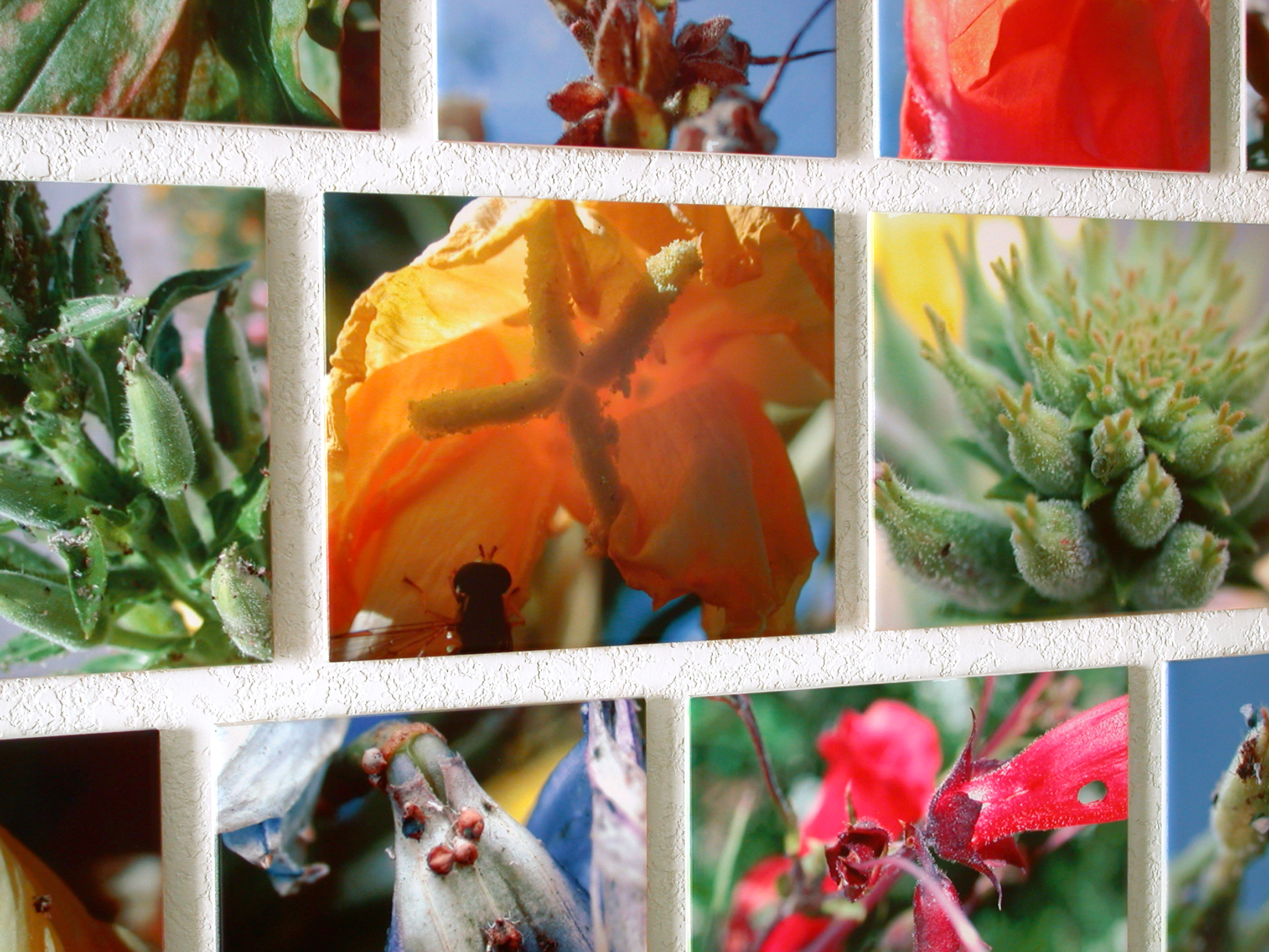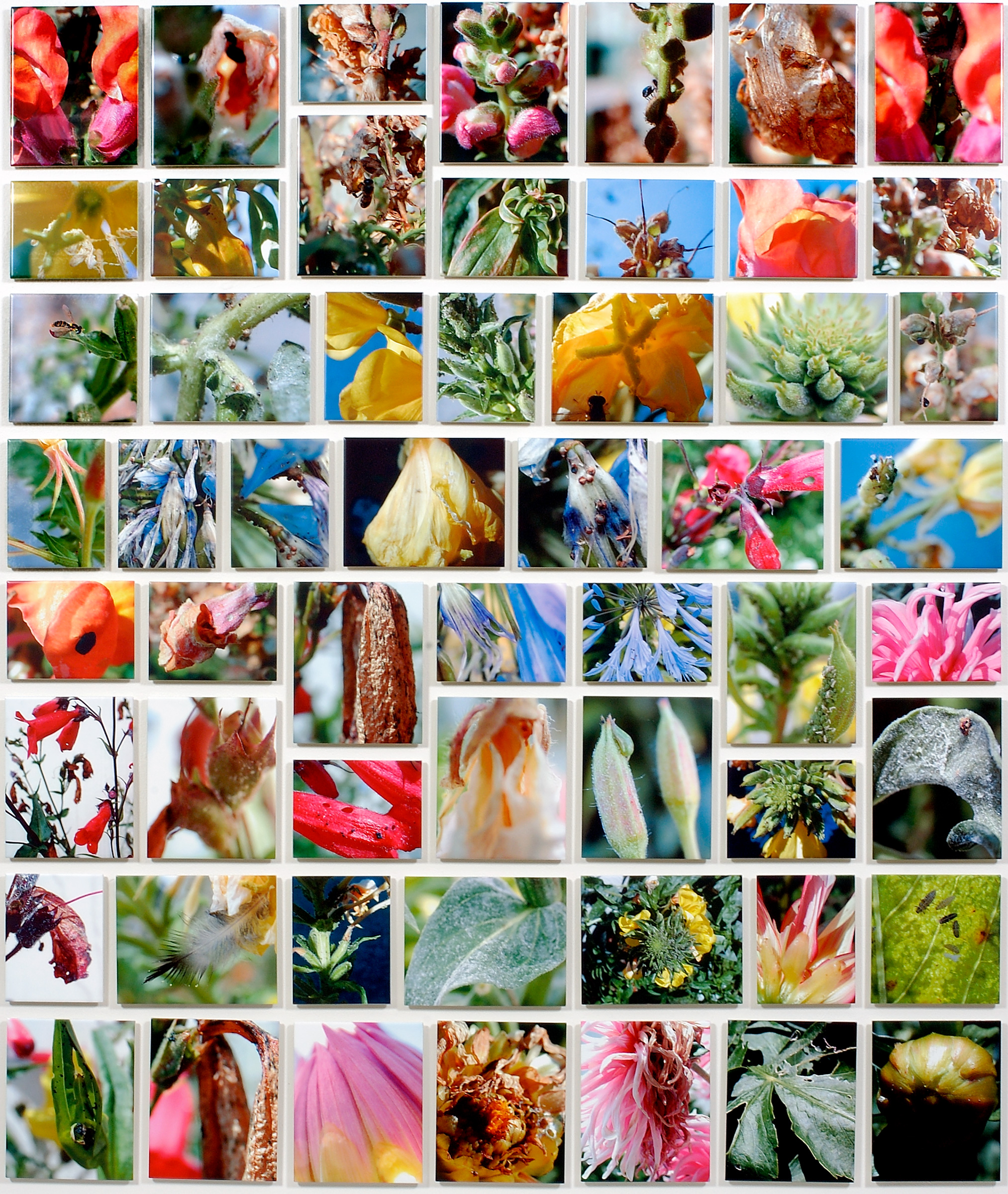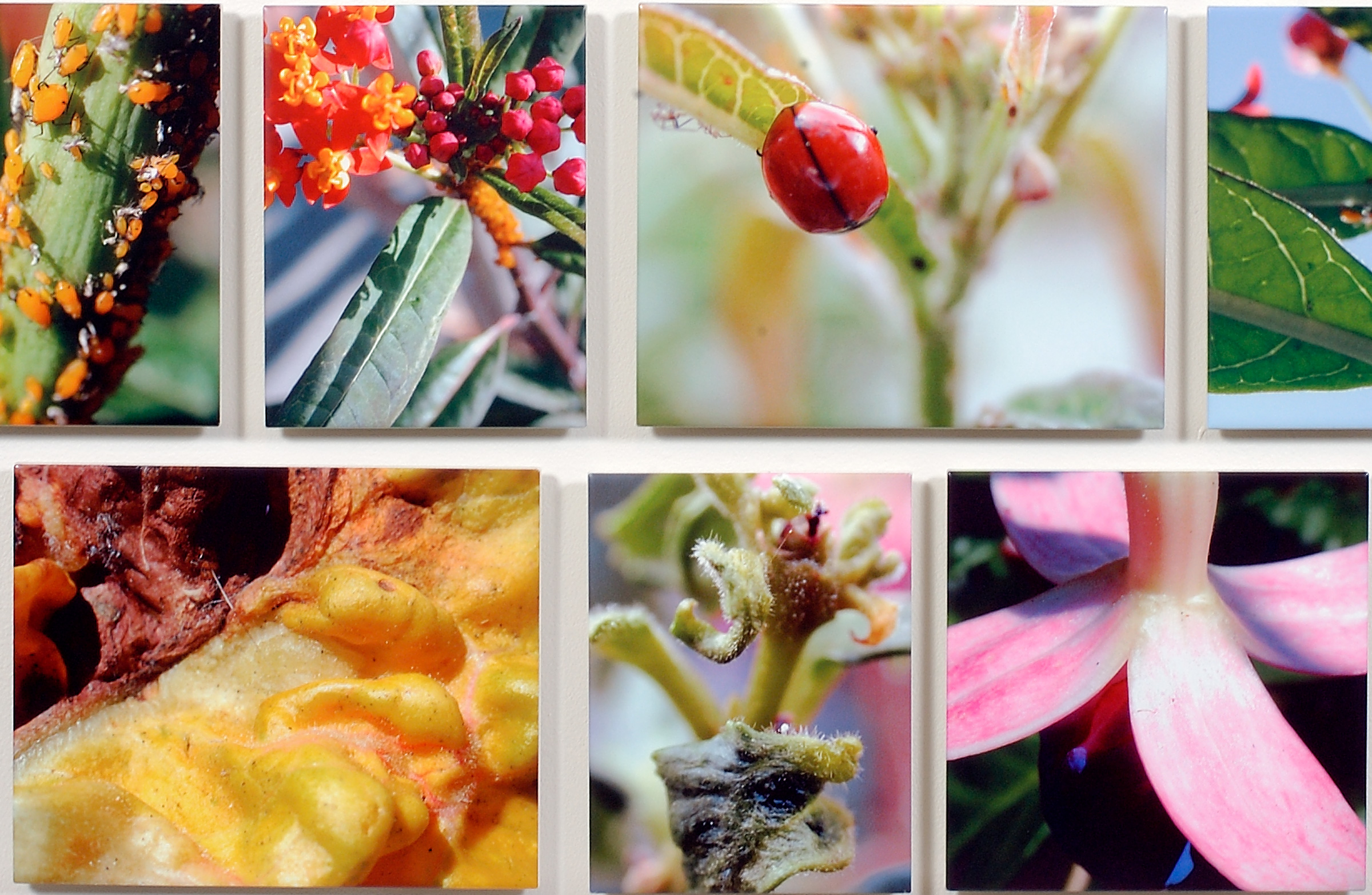 The images in Corollas (2004) are predominately of insects and fungi associated with the flowers in a garden of snapdragon, evening-primrose, agapanthus, penstemon and dahlia. (The term corolla refers to the aggregate of petals on a flower, especially if those petals are joined into a cup or tube.) Of note here is the presence on two plant species of little brown globes called aphid “mummies.” These are the expanded shells of aphids which were consumed from the inside by larvae of tiny parasitoid wasps. The adult wasp lays an egg inside an aphid. The aphid stops feeding and itself become food for the larva that hatches from the wasp egg. The presence of the larva causes the exoskeleton of the aphid to expand and harden. After the larva pupates inside the mummy, the new adult wasp cuts an exit hole in the mummy, emerges and continues the cycle.