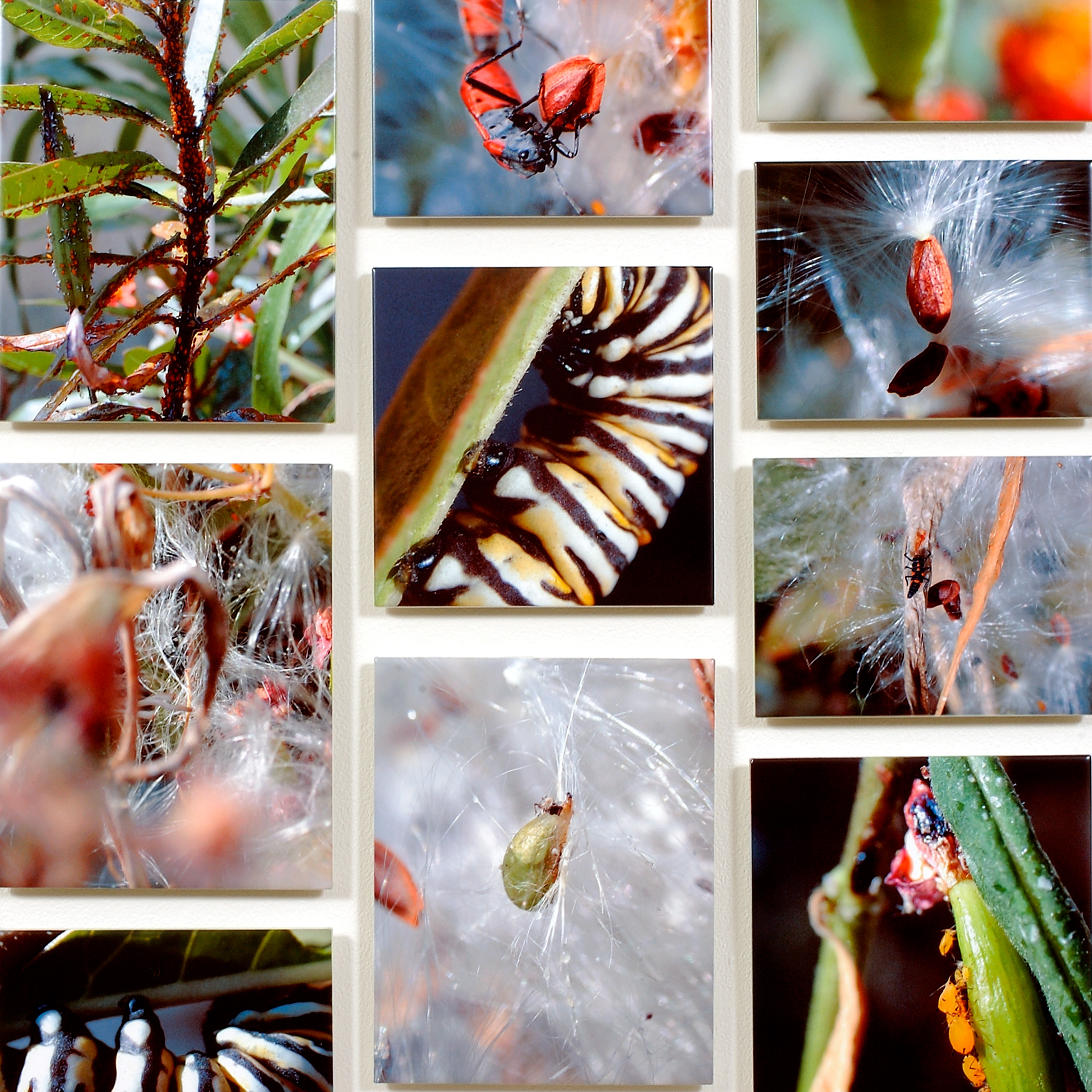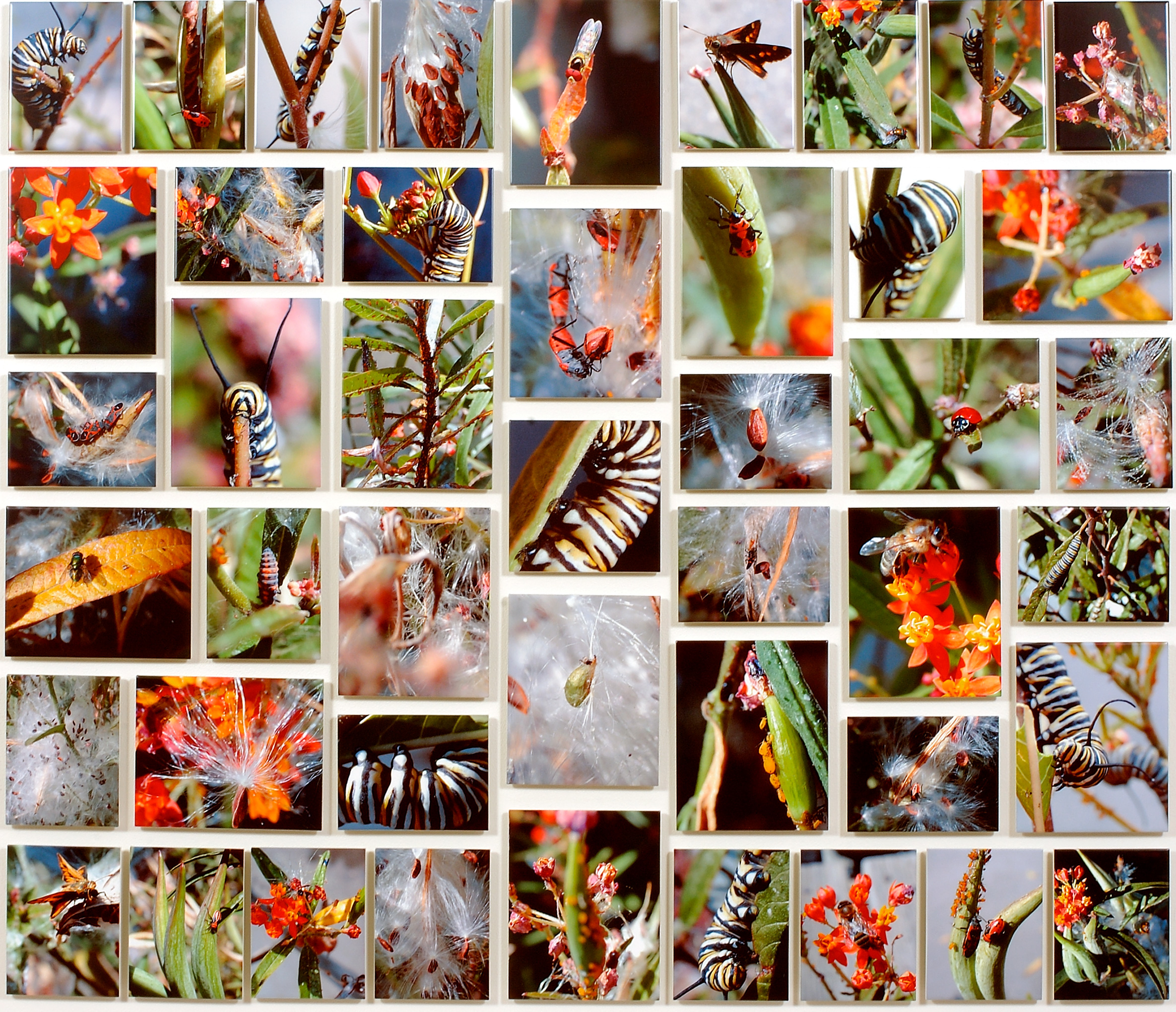 Milkweed plants support a surprising variety of insect species, as seen in Mother’s Milk(weed) (2005). Although the milky juice of the plants is toxic to many herbivores, some species, such as the monarch butterfly, the milkweed bug, and the oleander aphid, have, through long evolutionary association, come to actually depend on this plant. Indeed, the larva of the monarch can eat nothing else.
