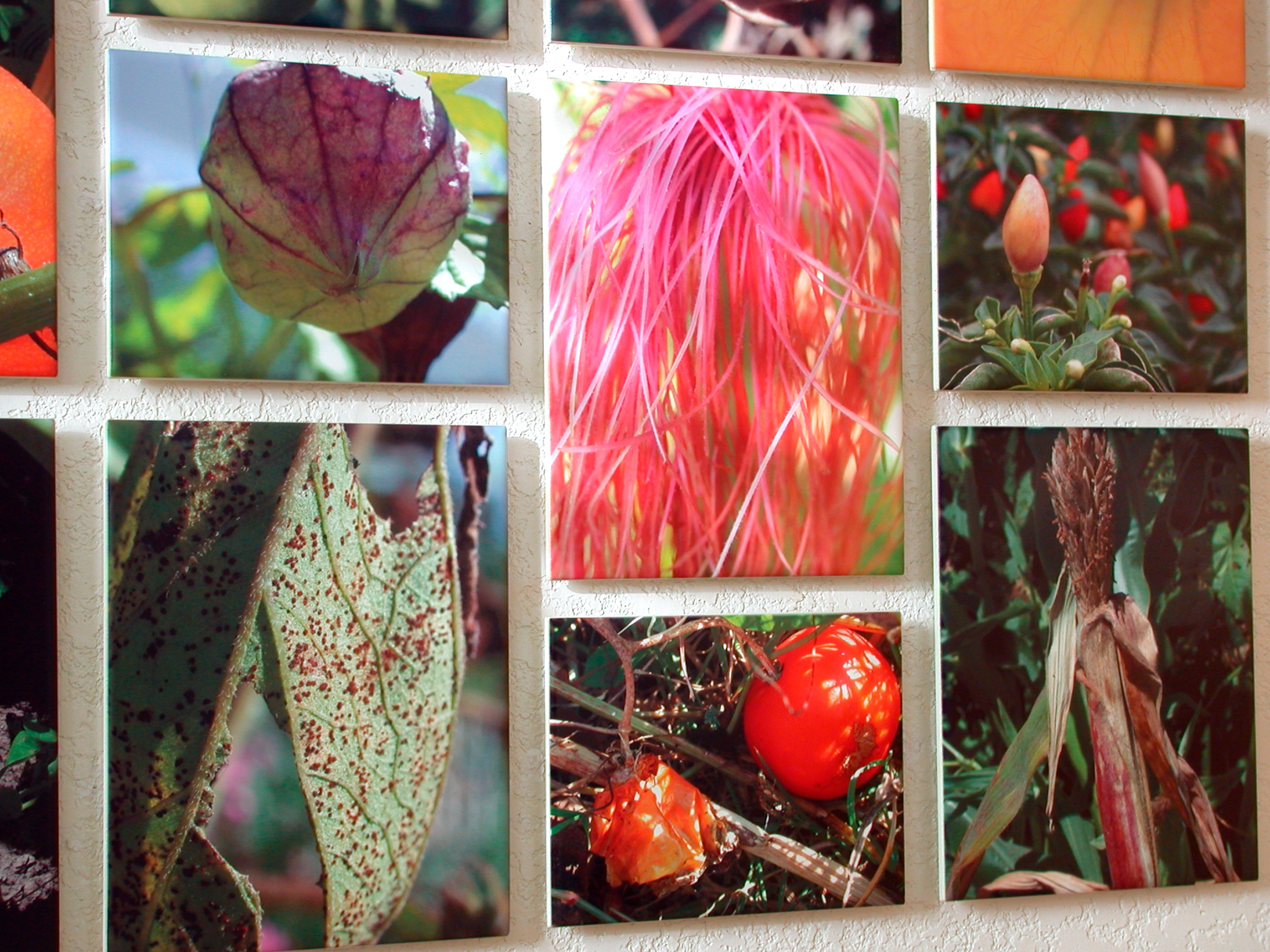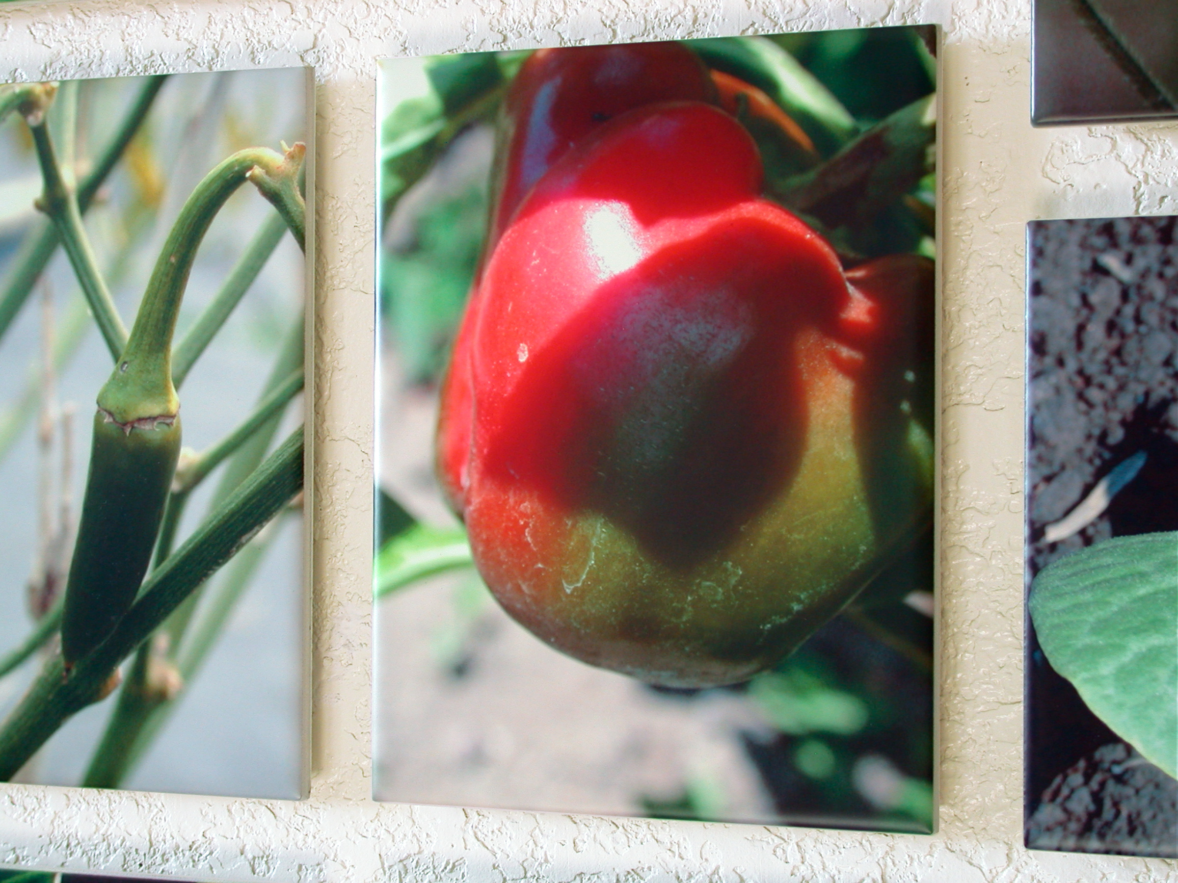 The culmination of the food garden (Fruition, 2006) is the harvest of tomatoes, peppers, grapes, squash and other yummy “vegetables.” Because these “vegetables” have seeds, botanically they are fruits, developed from the ovaries of flowers. Fruits are thought to have evolved in concert with animals as a way for stationary plants to get their offspring to new locations. The animals eat the highly nutritious fruits but the seeds pass through their digestive tracts intact. The seeds are eventually deposited with a blob of fertilizer somewhere away from the parent plant. Both parties benefit. We and our food plants employ the same mutualistic agreement (although the method of seed distribution is different). We select the plants we like (for instance, those that are the biggest, or the most flavorful, or that ripen earliest), then deliberately propagate those plants. So like their wild relatives, our food plants effectively use their animal “predator” to increase their own populations.