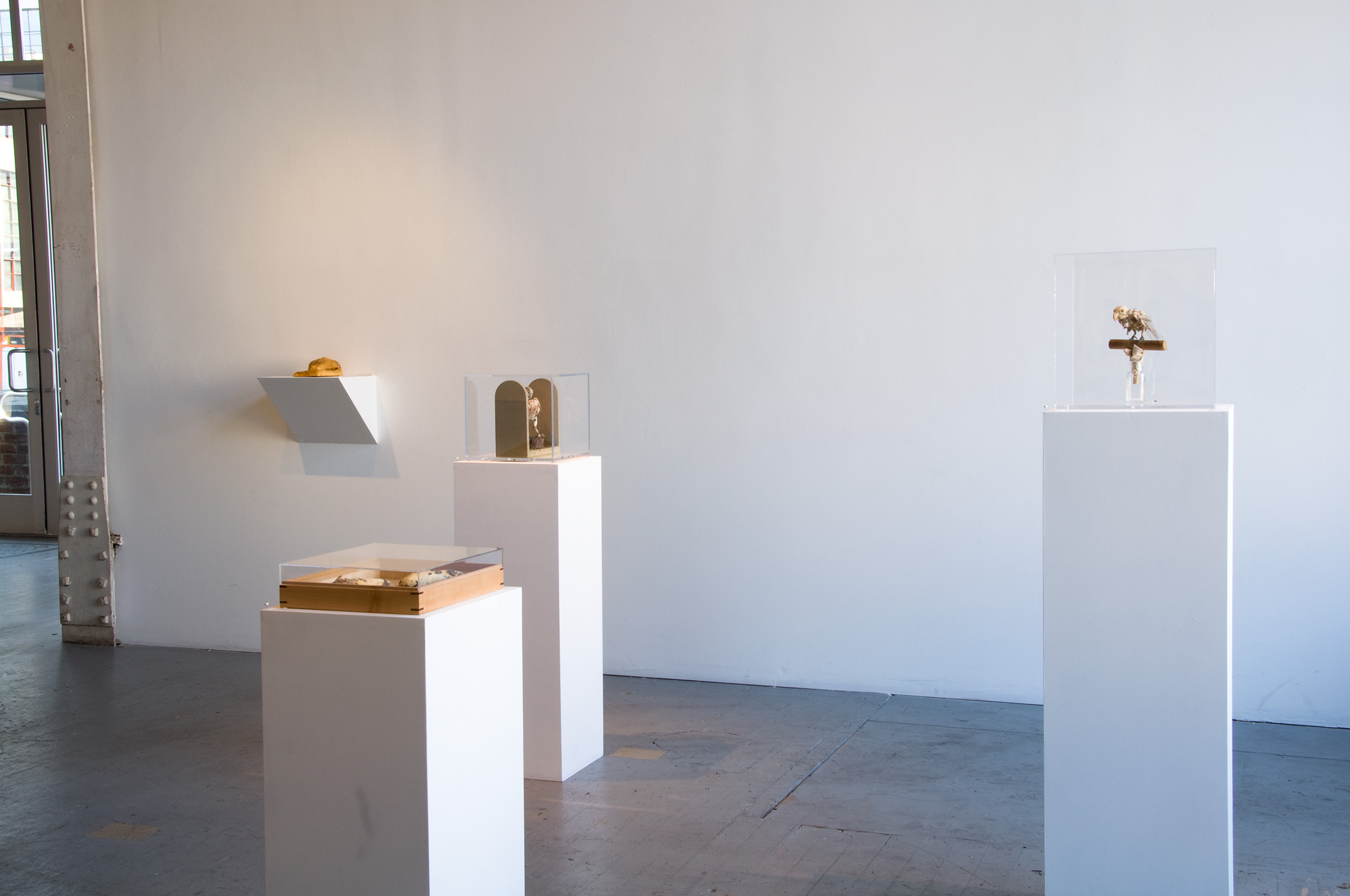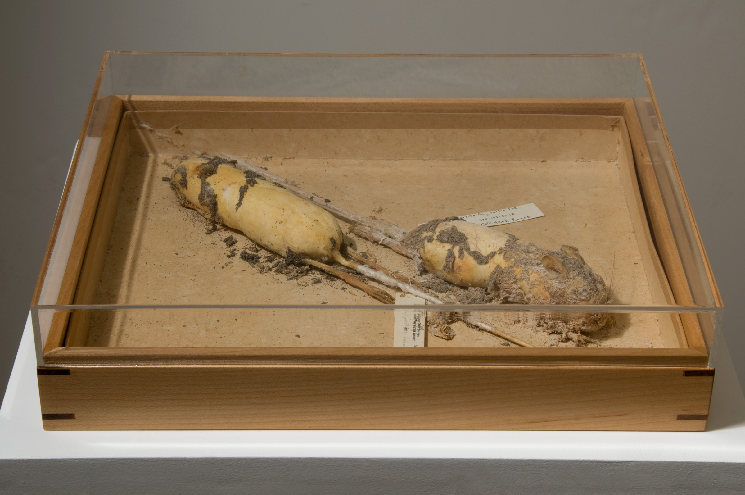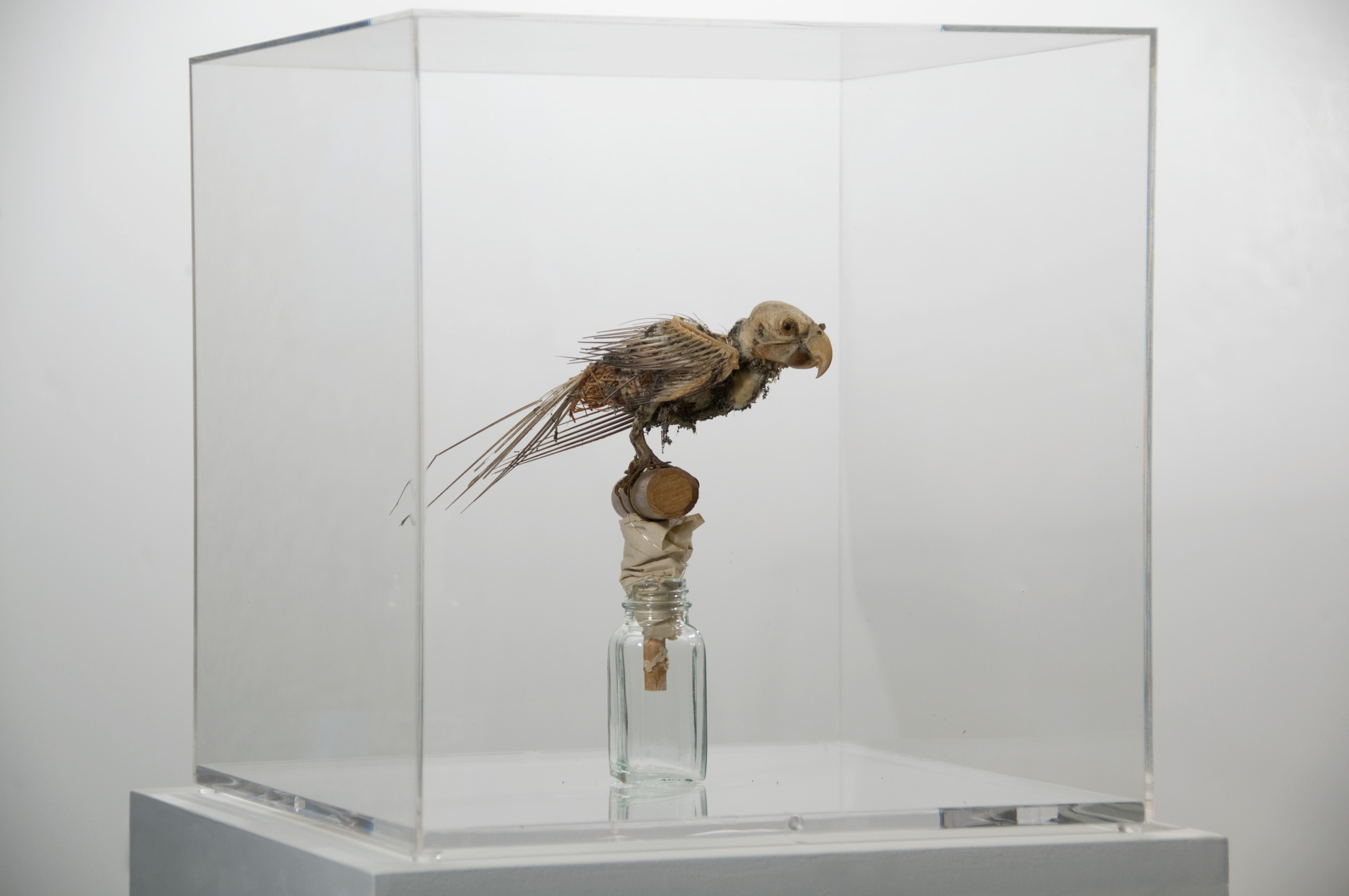 The tattered remains of taxidermied and prepared specimens of Protected, Neglected, and Lost represent parts of the natural world that we let slip away because we are busy doing other things. These specimens (parrot, burrowing owl, kangaroo rats) were once carefully prepared, apparently important. But because of inattention and neglect, they were lost. All that remains are bones and hard parts and the cotton that replaced their flesh. Their supposedly protective environments were thoughtlessly damaged or eliminated, thereby admitting scavenging dermestid beetles.
