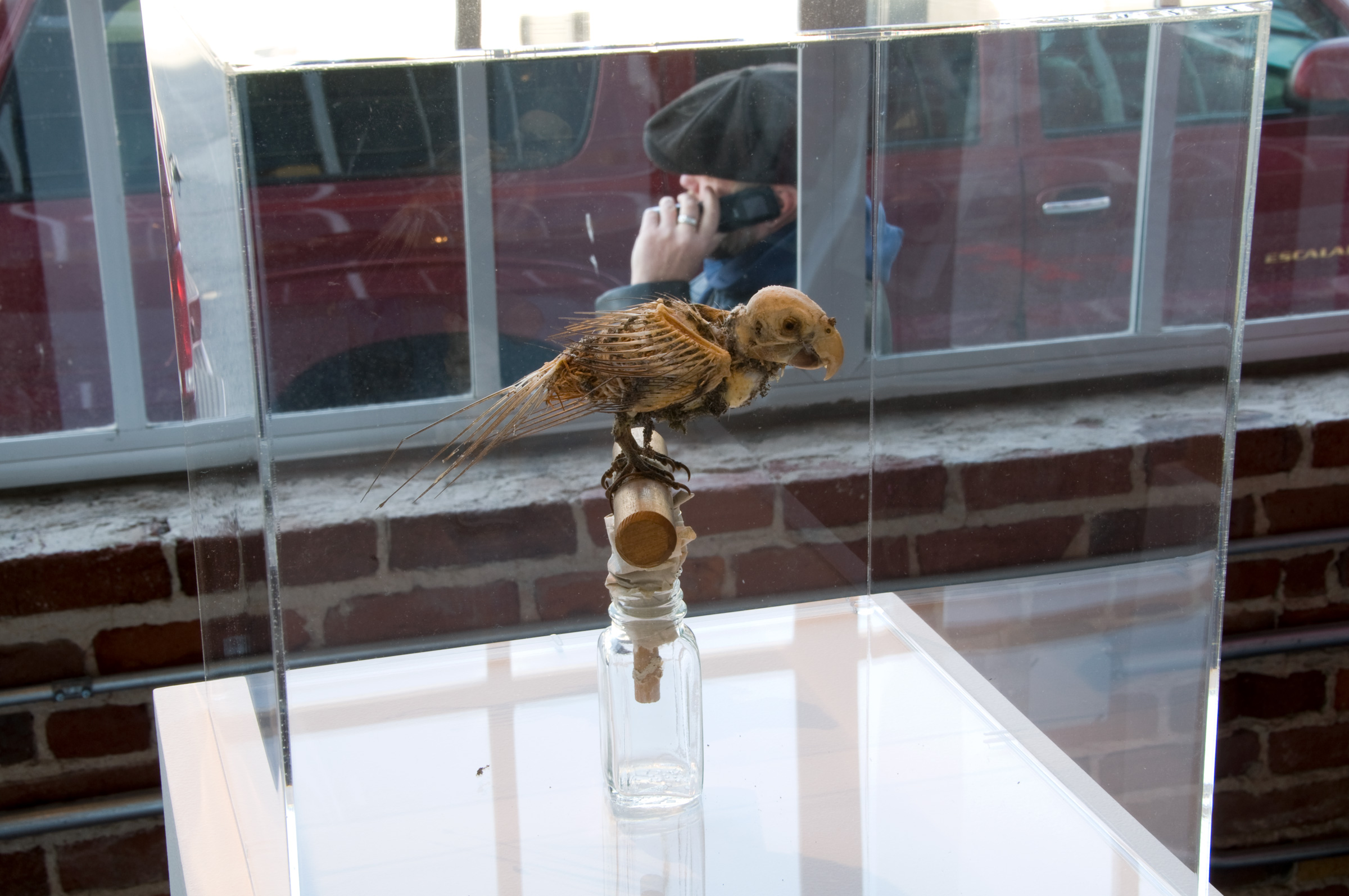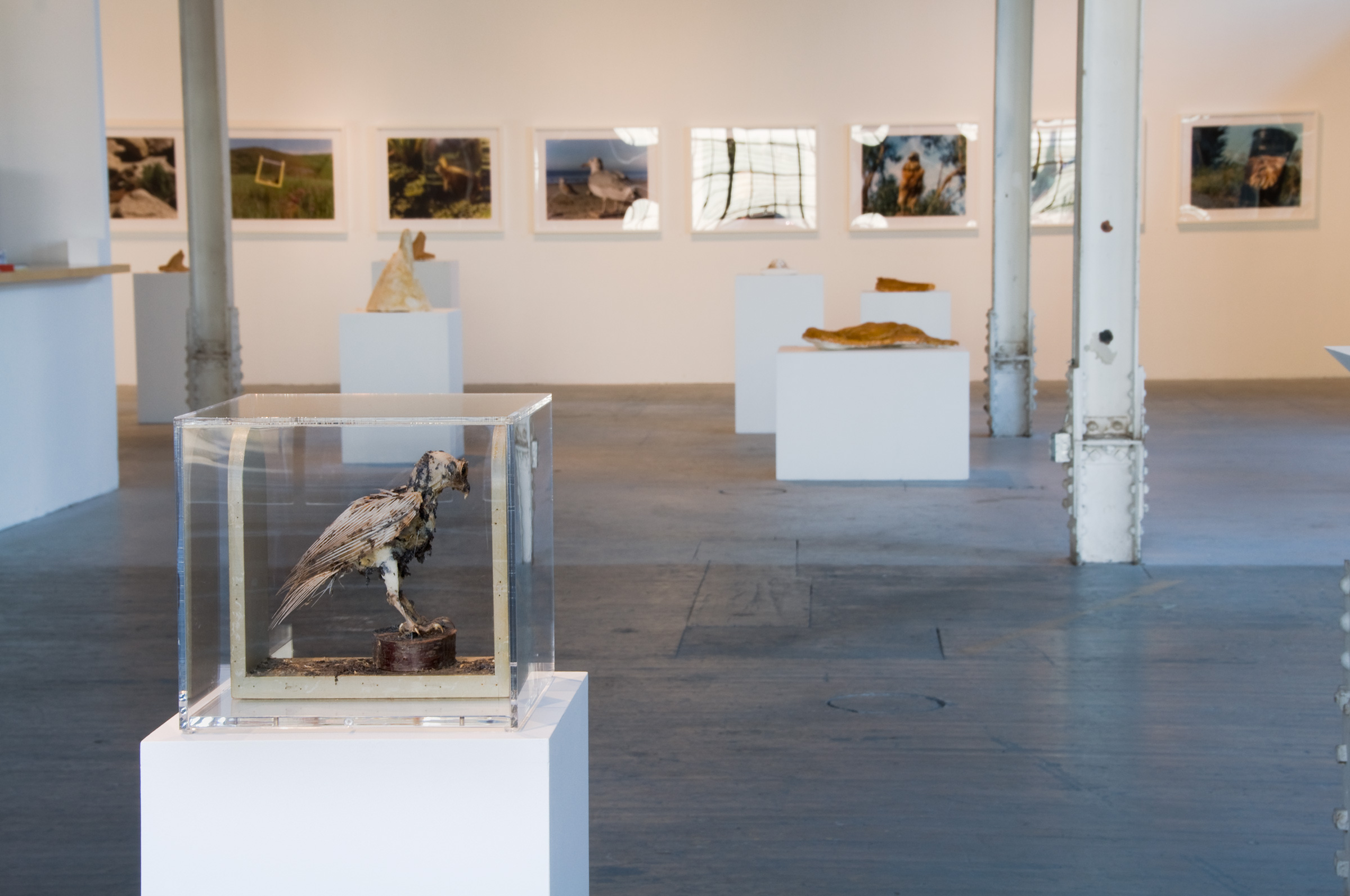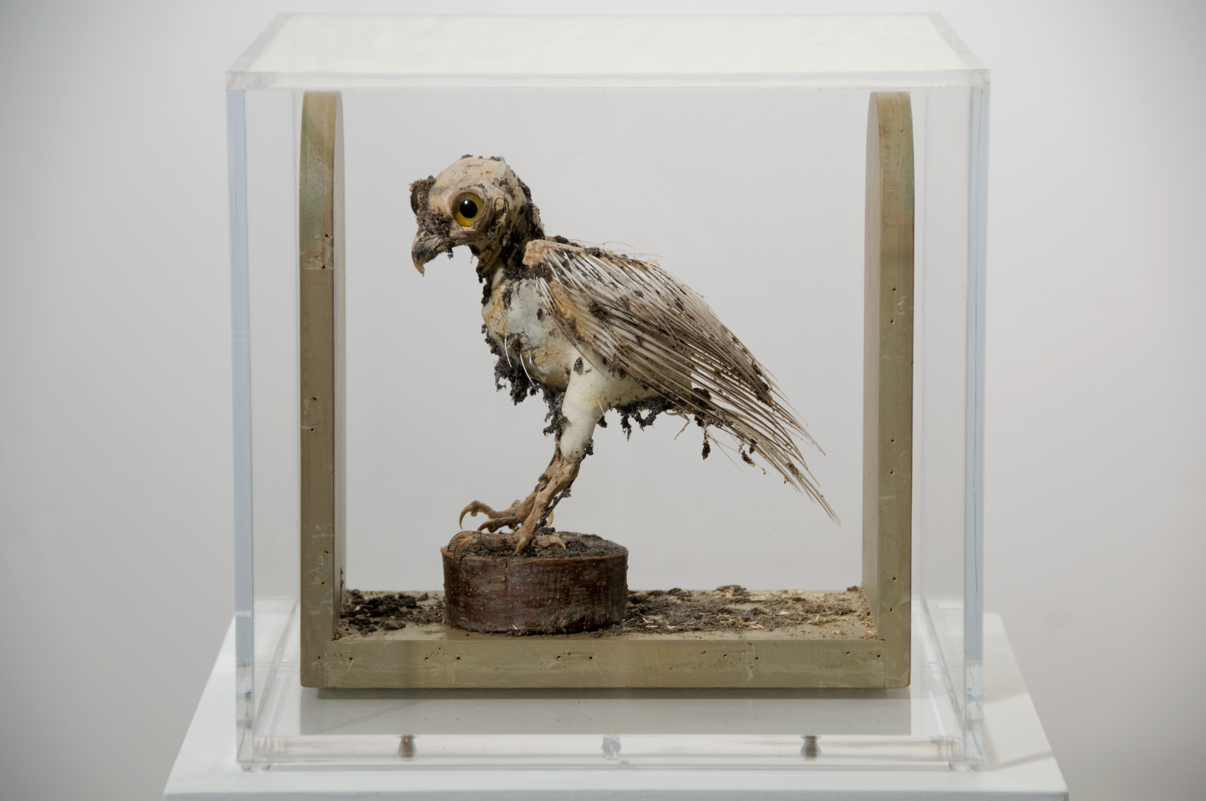 The tattered remains of taxidermied and prepared specimens of Protected, Neglected, and Lost represent parts of the natural world that we let slip away because we are busy doing other things. These specimens (parrot, burrowing owl, kangaroo rats) were once carefully prepared, apparently important. But because of inattention and neglect, they were lost. All that remains are bones and hard parts and the cotton that replaced their flesh. Their supposedly protective environments were thoughtlessly damaged or eliminated, thereby admitting scavenging dermestid beetles.