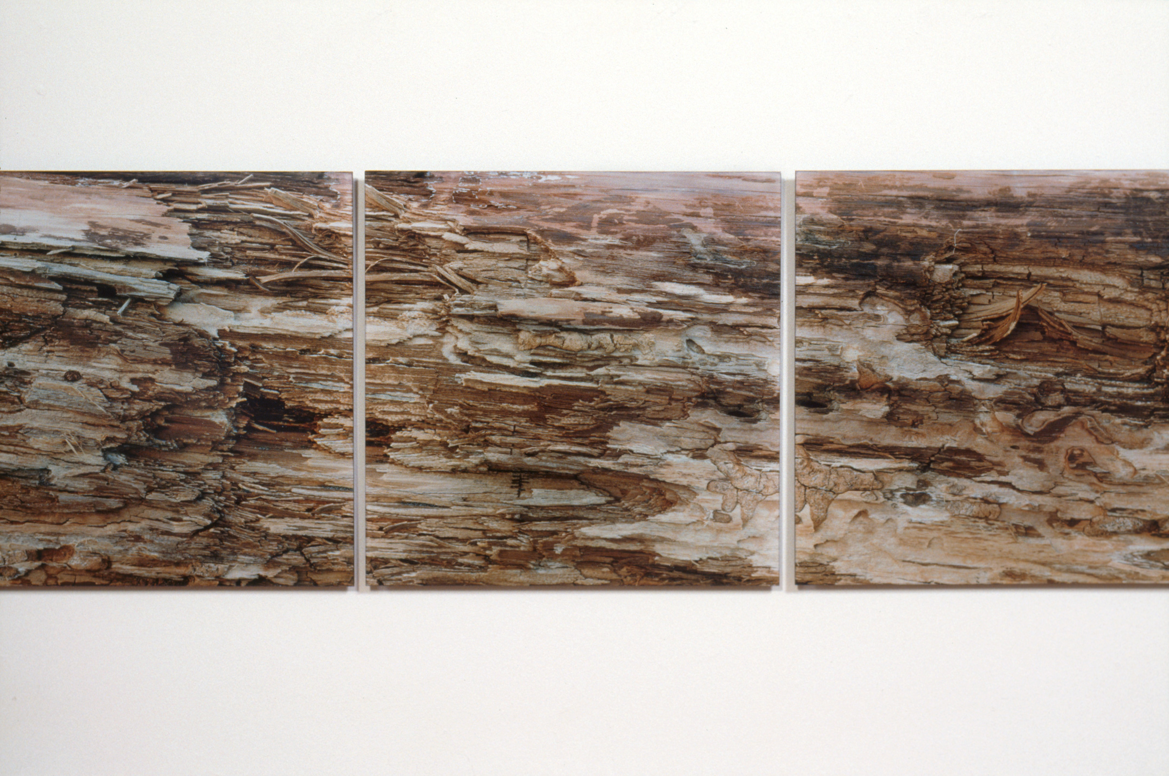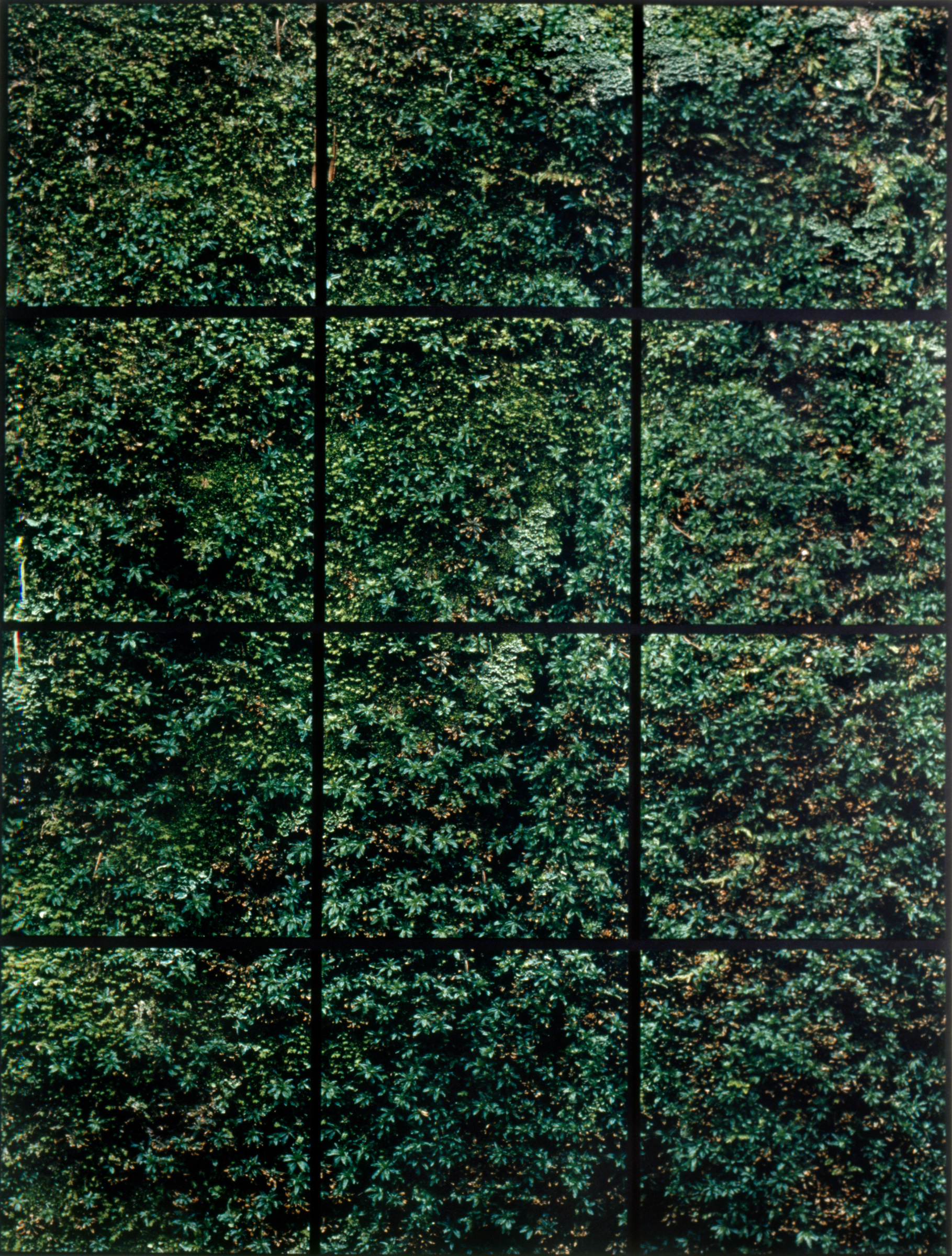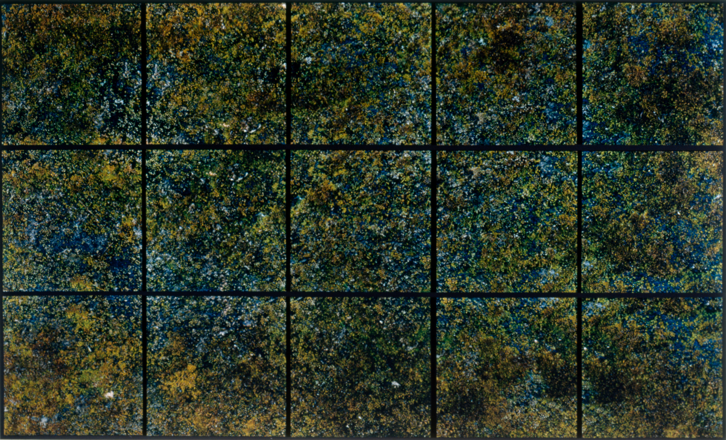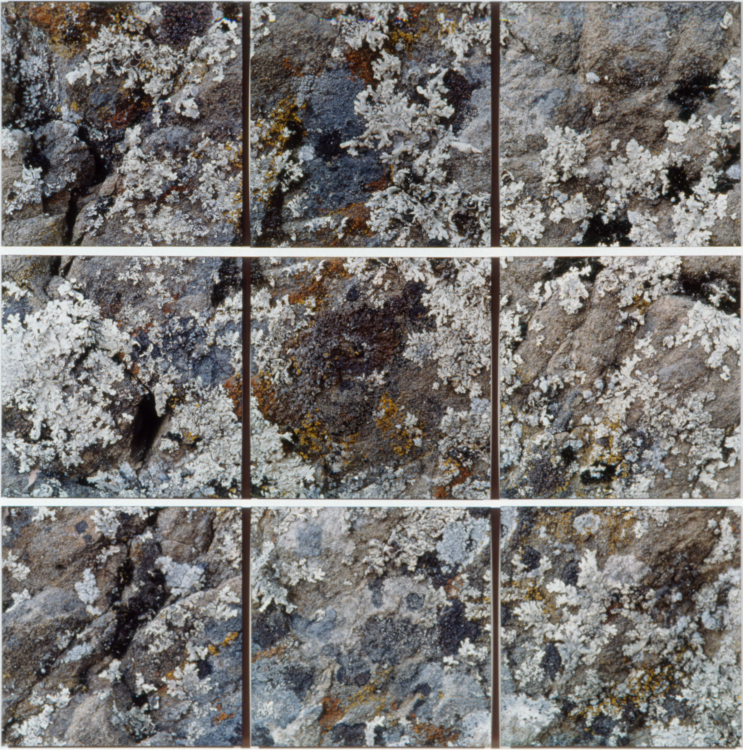 To make these works, I photographed, in color, a small area of a natural pattern (structure) formed by interacting organisms (such as tiny mosses) or tissues (such as a weathered log). But to emphasize the pattern as a system of components while retaining small details, I divided the area into 9-18 individual, square frames. I enlarged and rejoined the frames into a grid, the shape of which varied according to the structure photographed. The area covered by any single frame of film was based on the size of the pattern photographed. Each frame must itself convey a certain amount of “information,” and when all the frames are rejoined, a larger pattern must emerge. Topography not evident in any one frame jumps out in the reconstructed image.