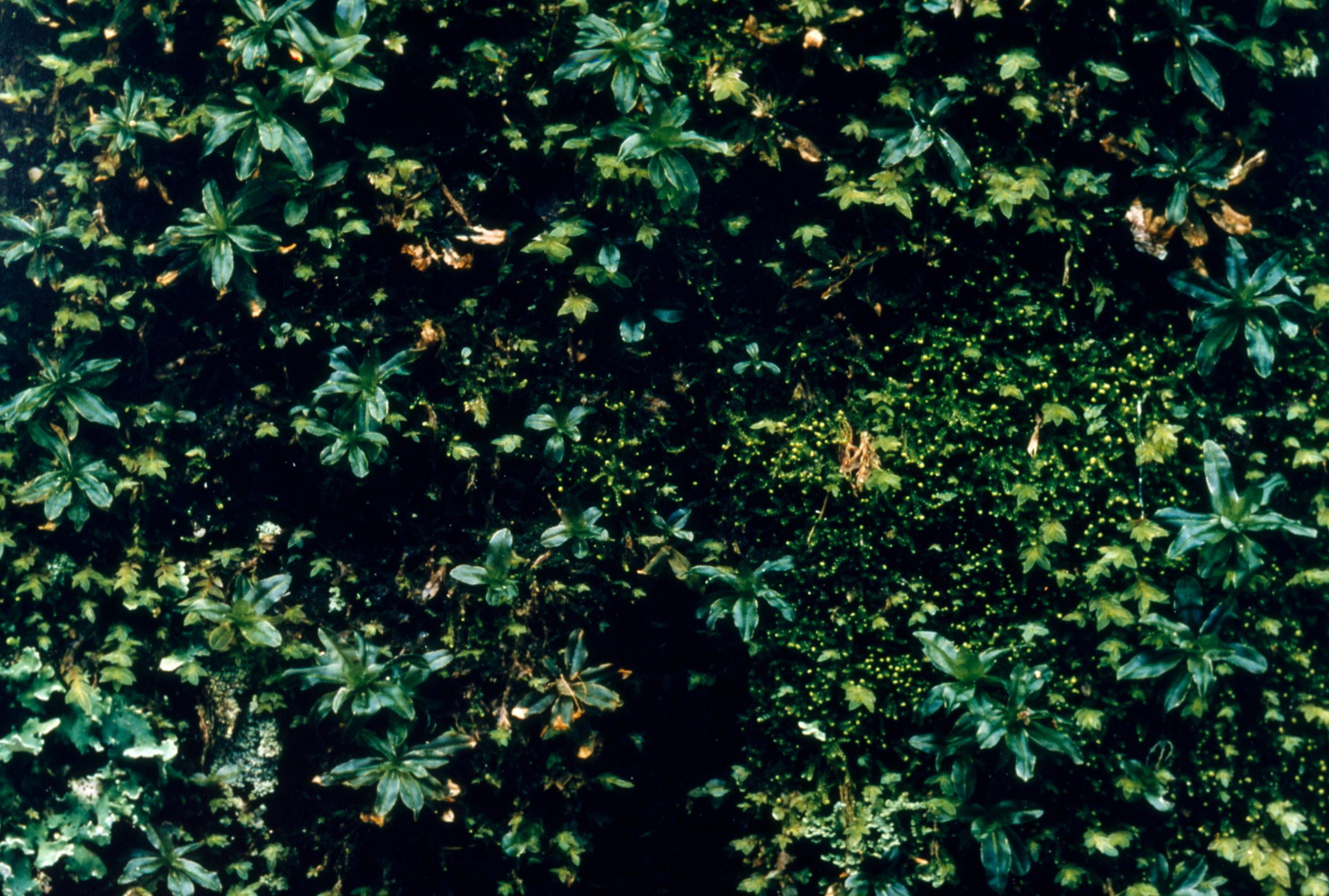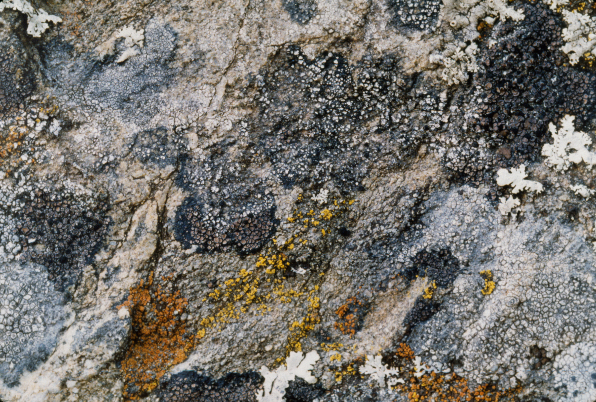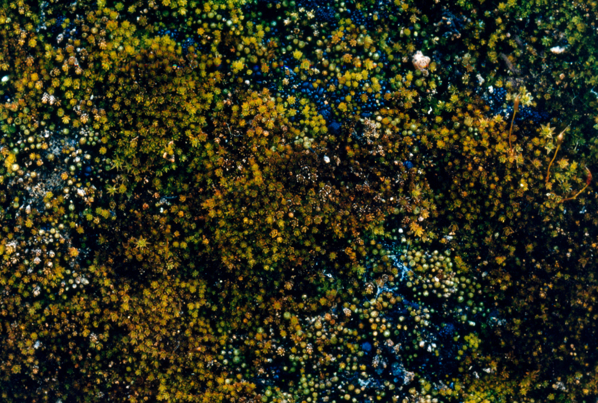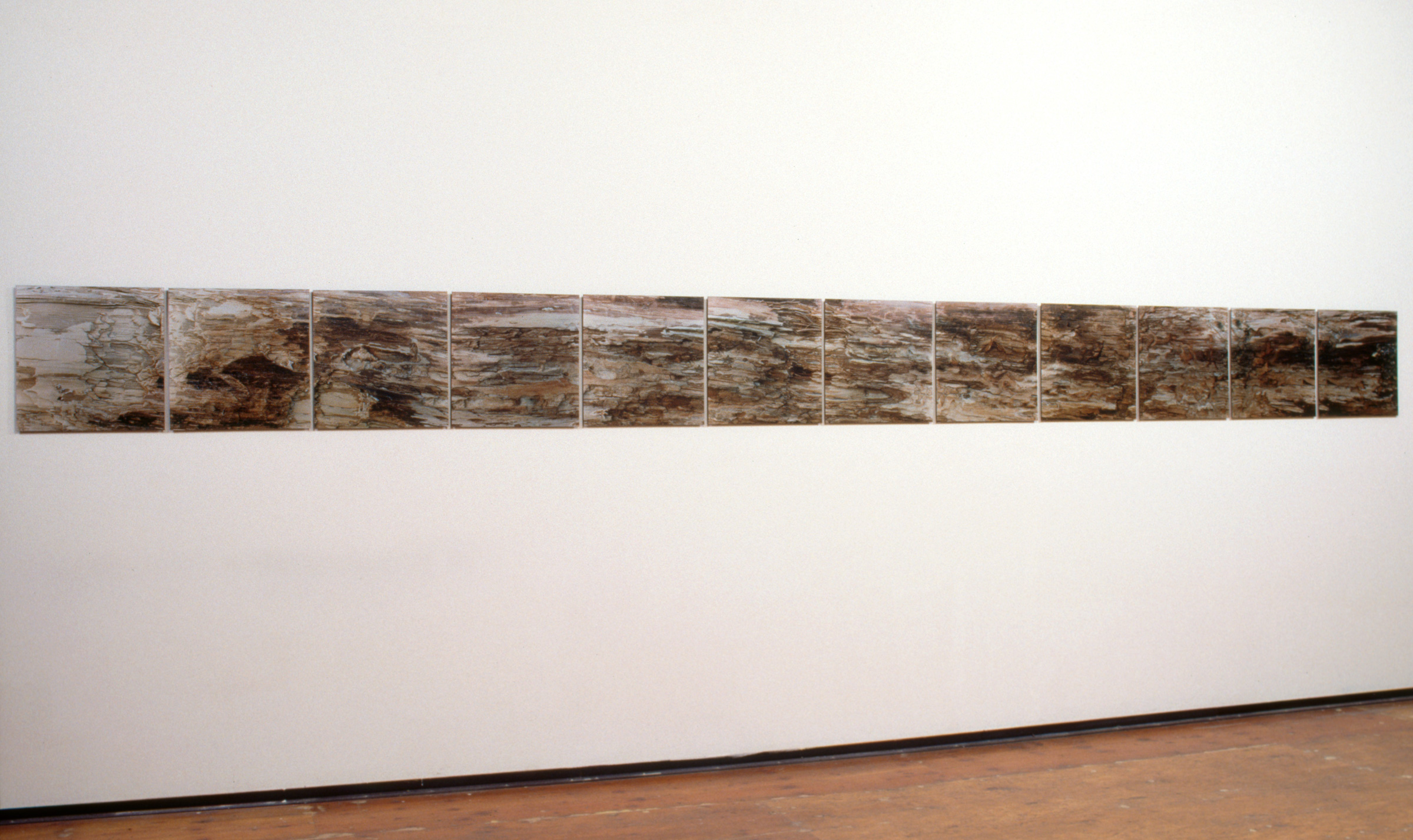 To make these works, I photographed, in color, a small area of a natural pattern (structure) formed by interacting organisms (such as tiny mosses) or tissues (such as a weathered log). But to emphasize the pattern as a system of components while retaining small details, I divided the area into 9-18 individual, square frames. I enlarged and rejoined the frames into a grid, the shape of which varied according to the structure photographed. The area covered by any single frame of film was based on the size of the pattern photographed. Each frame must itself convey a certain amount of “information,” and when all the frames are rejoined, a larger pattern must emerge. Topography not evident in any one frame jumps out in the reconstructed image.